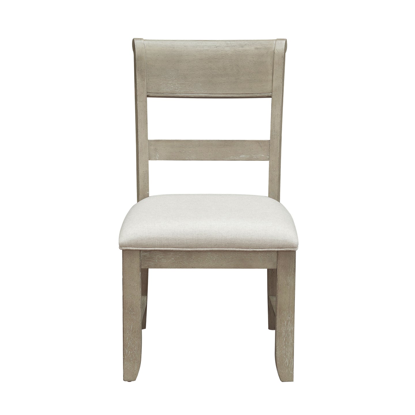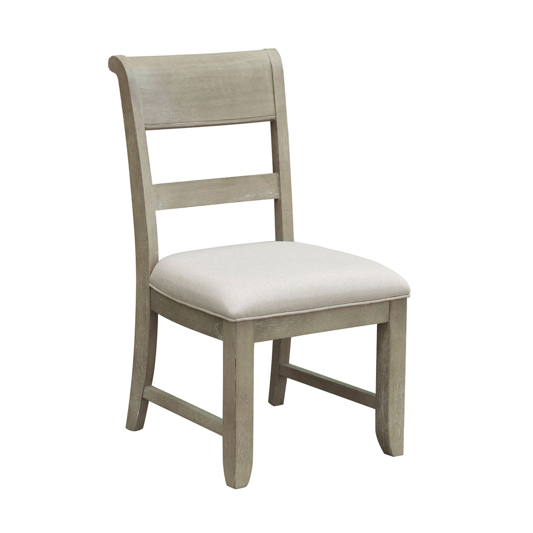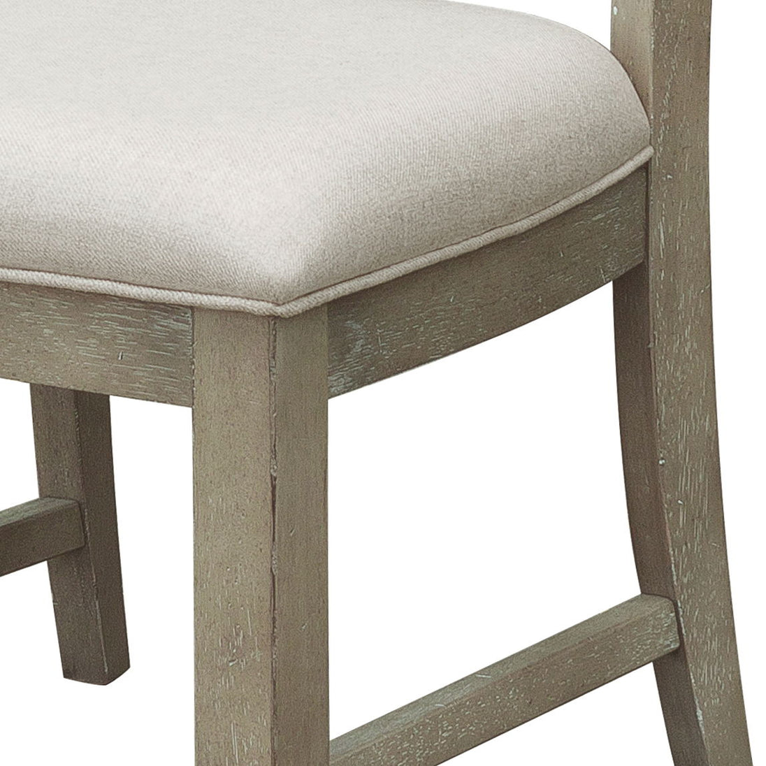 - Weathered and gently distressed gray finish with linen look upholstery