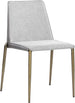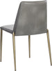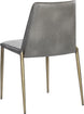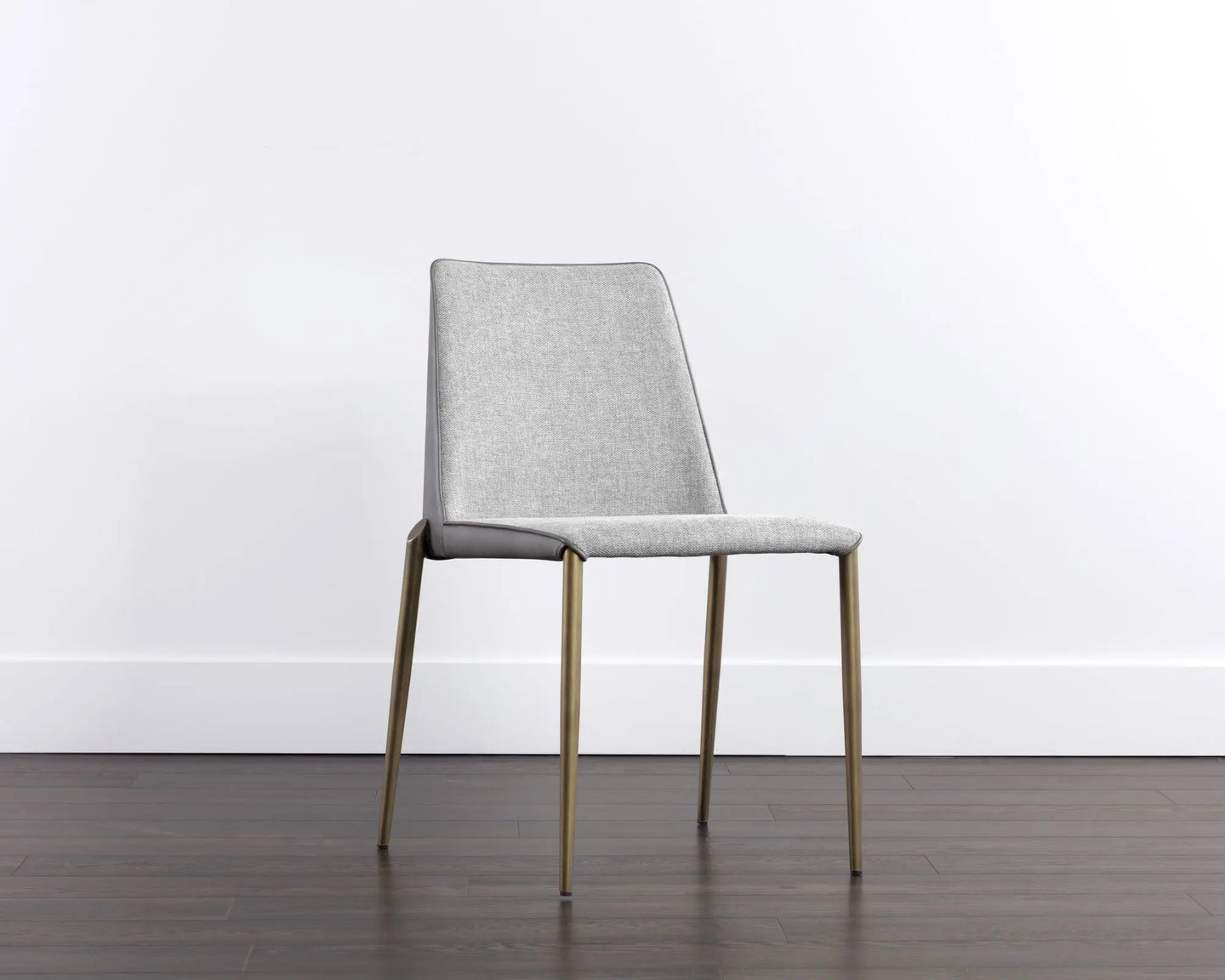 This modern, stackable dining chair offers a minimalist silhouette perfect for small urban settings. Features a comfortable seat in belfast heather grey fabric with a contrasting seat back in bravo metal faux leather. Completed with powder coated steel legs in antique brass. Also available in dillon stratus with dillon black and belfast oatmeal with bravo cognac. Handle With Care: This design has been crafted with faux leather. Faux leather is manufactured to reflect the natural characteristics of leather; as such, colour variations, markings wrinkles, grooves, and light scratches are appreciated characteristics. No two pieces will be alike. Visit our Product Care page for more information on how to ensure the lasting beauty of this piece.