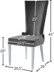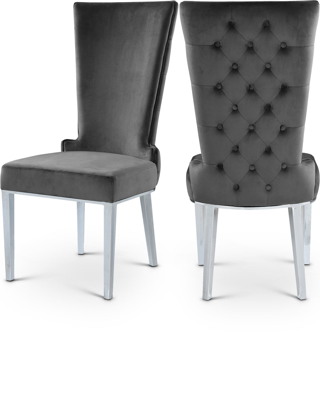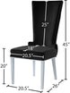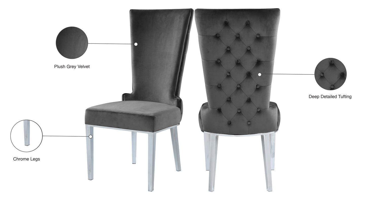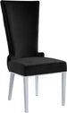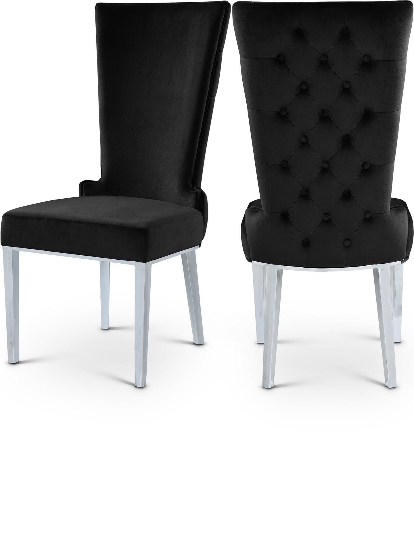 Draw the attention of anyone who steps foot in your living space with this Serafina Black Velvet Dining Chair from Meridian Furniture. Its luxurious black velvet upholstery is both soft and elegant, adding a chic touch to your home. Its high back with a deep button tufted design gives this stylish chair a regal appearance, while rich chrome metal legs complement its black color while providing sturdy support to the chair's frame.