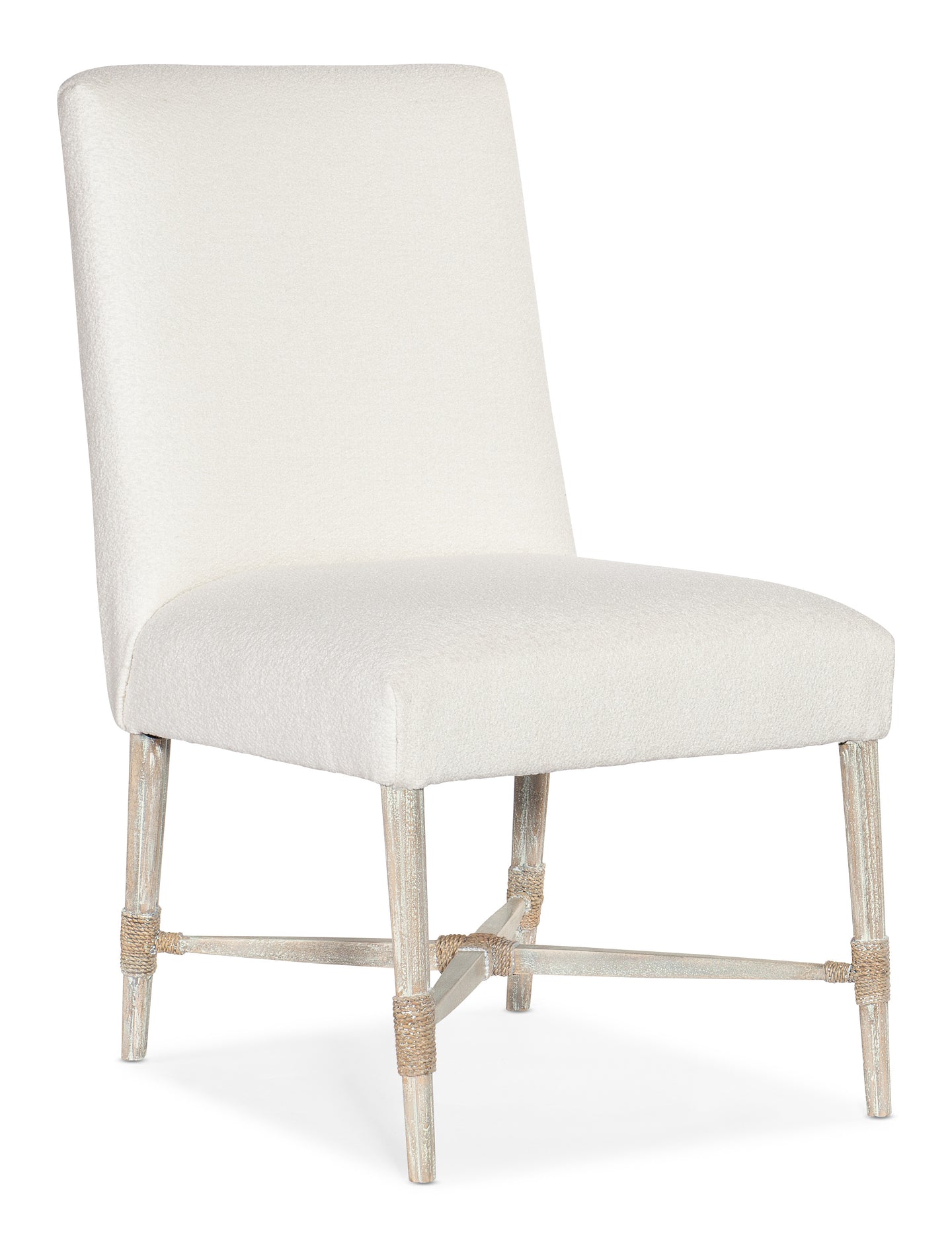 Laidback and inviting, the Serenity Side Chair brings the relaxed aura of the outside in. With a comfortable seat and back covered in the Macrame Artic fabric, the side chair is crafted of Beech Wood with rope-wrapped arms and a stylish X stretcher base. The light and airy Surf finish is a whitewashed color.