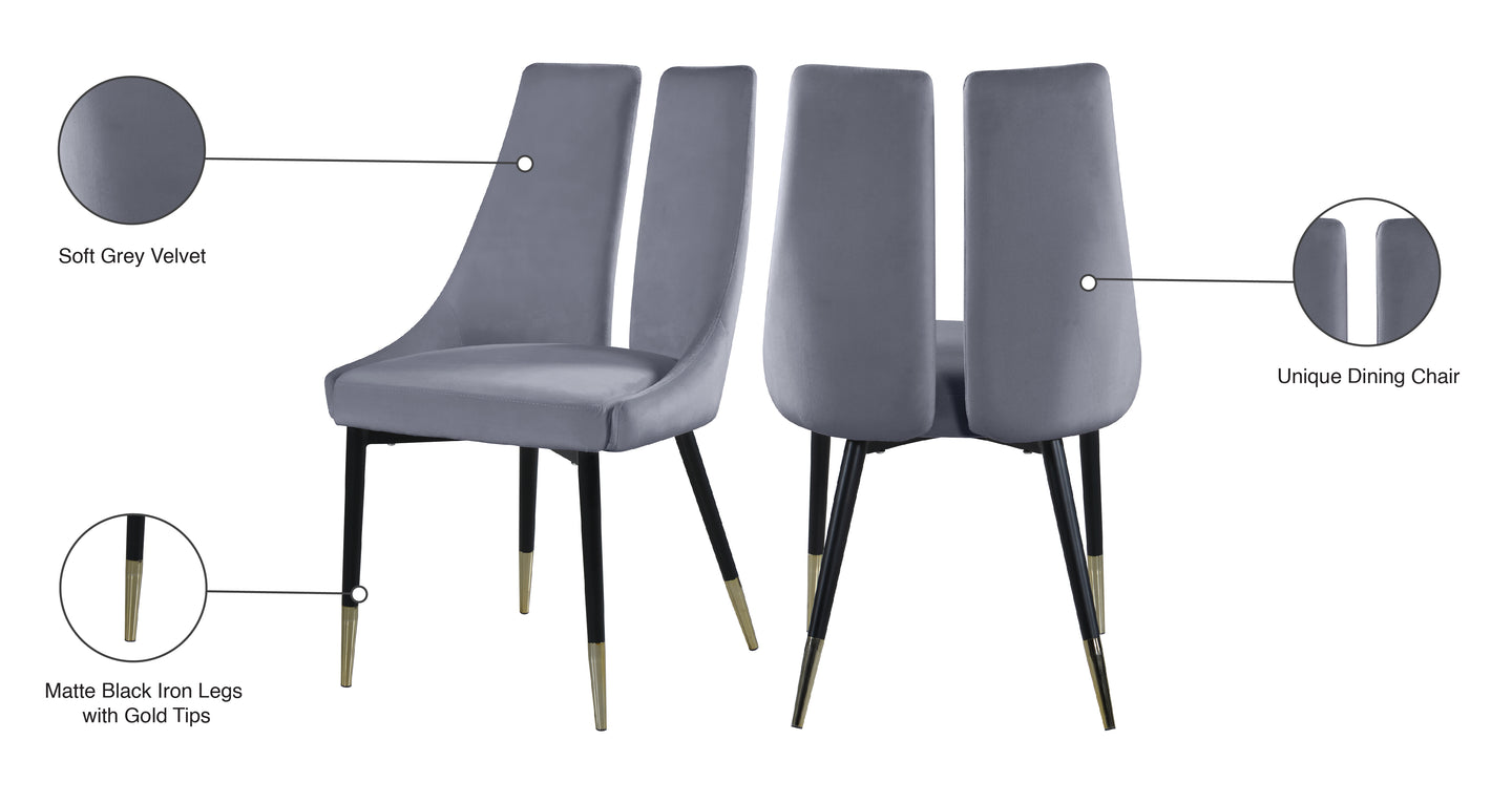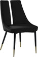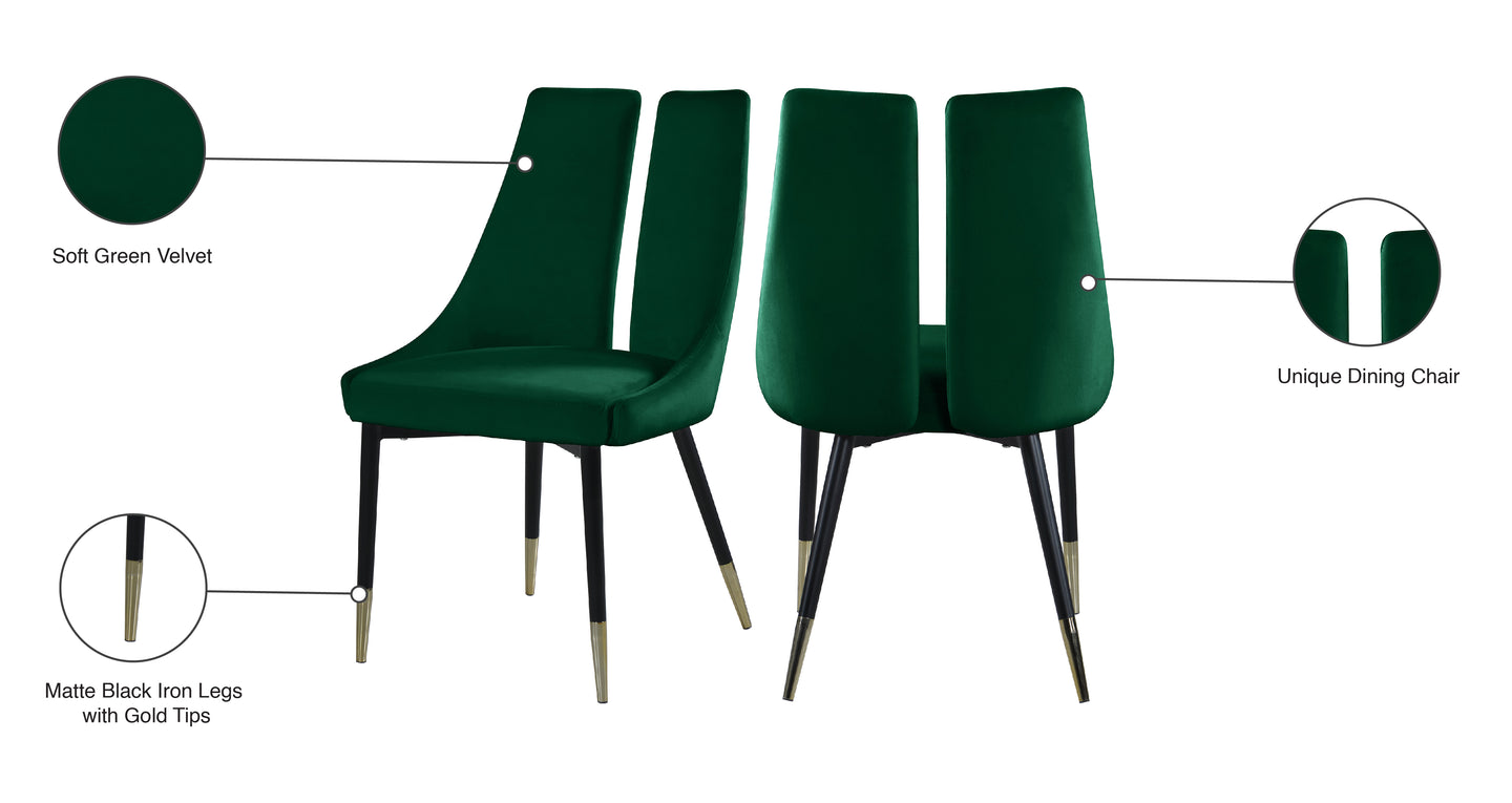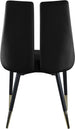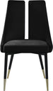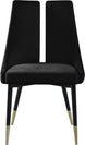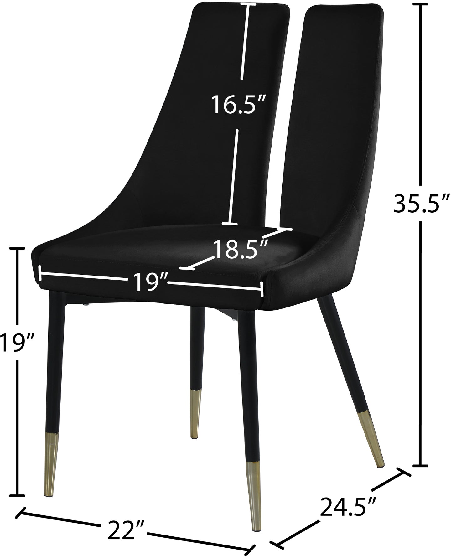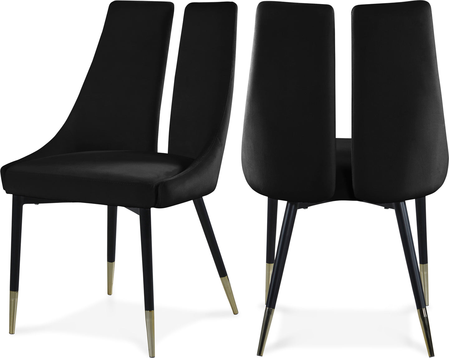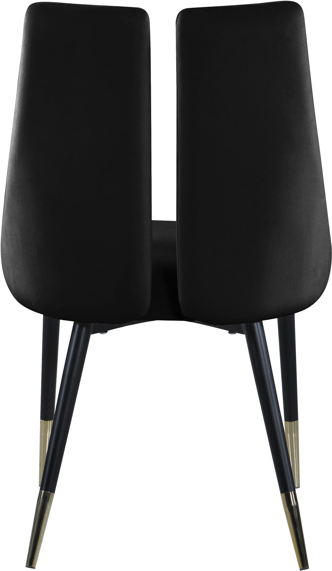 It doesn't get more modish than this! This Sleek velvet dining chair is the bees knees when it comes to contemporary design with its sculptural back and its clean lines. The chair is covered in soft black velvet upholstery material for a look that's modern and sophisticated. Matte black iron legs with gold tips gives the chair a hint of elegance.