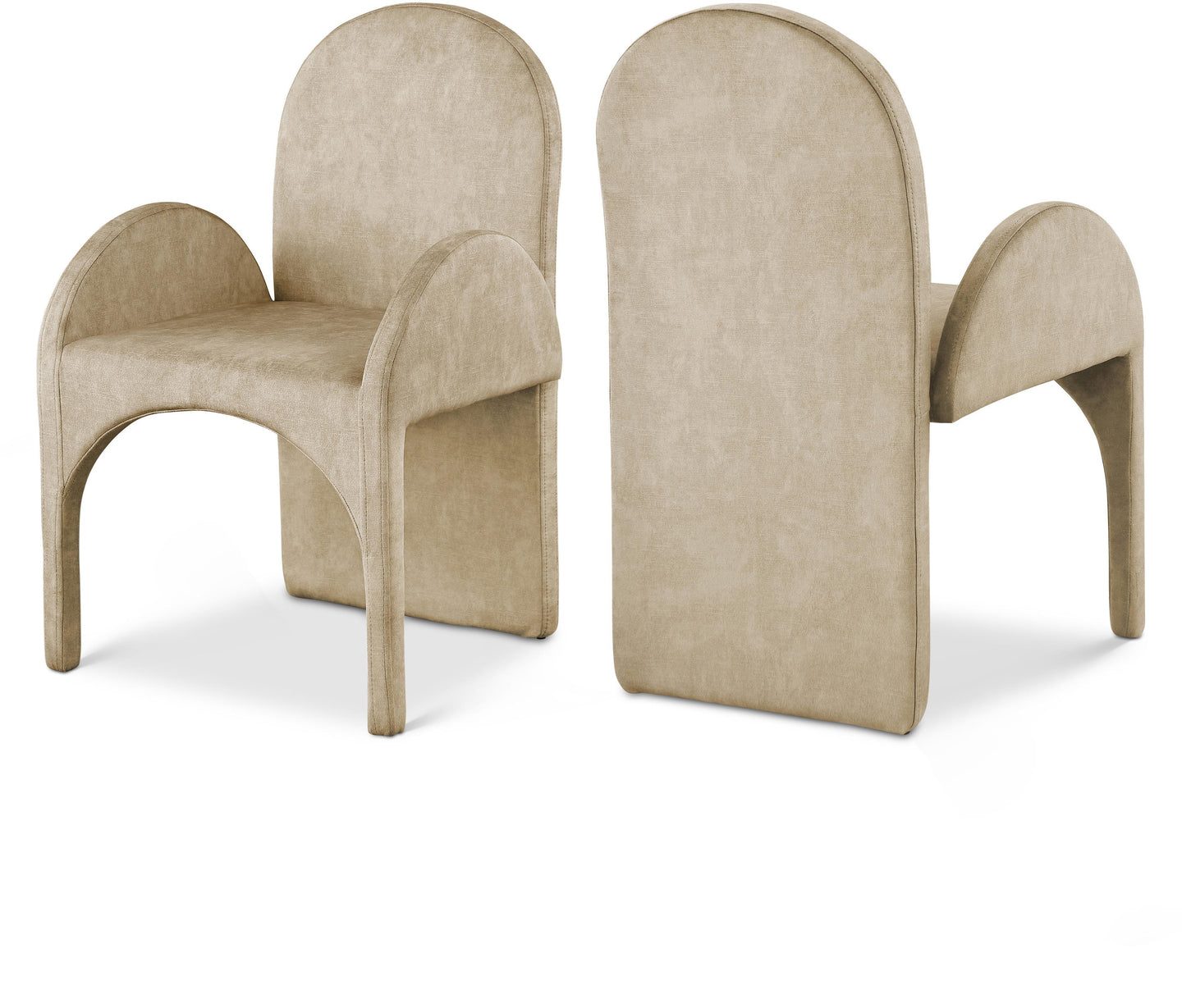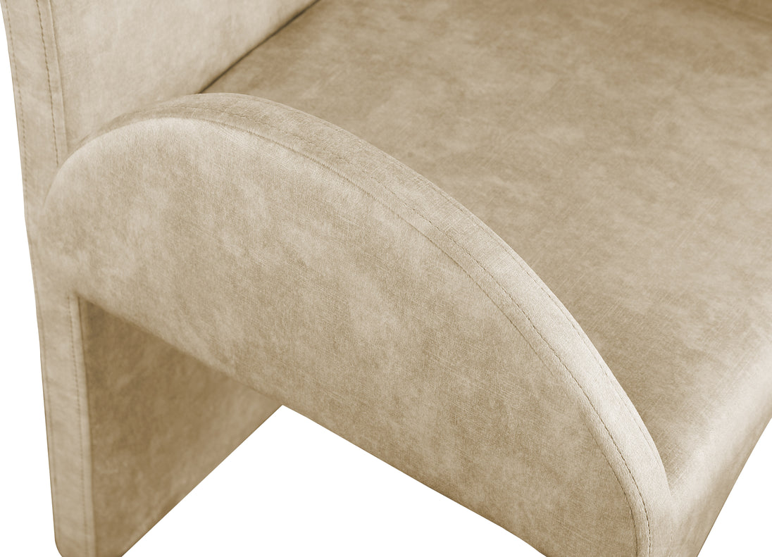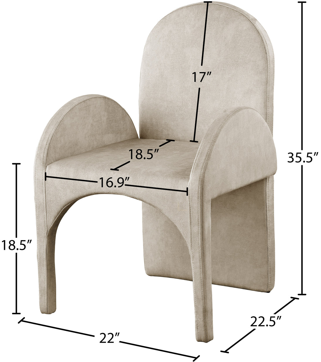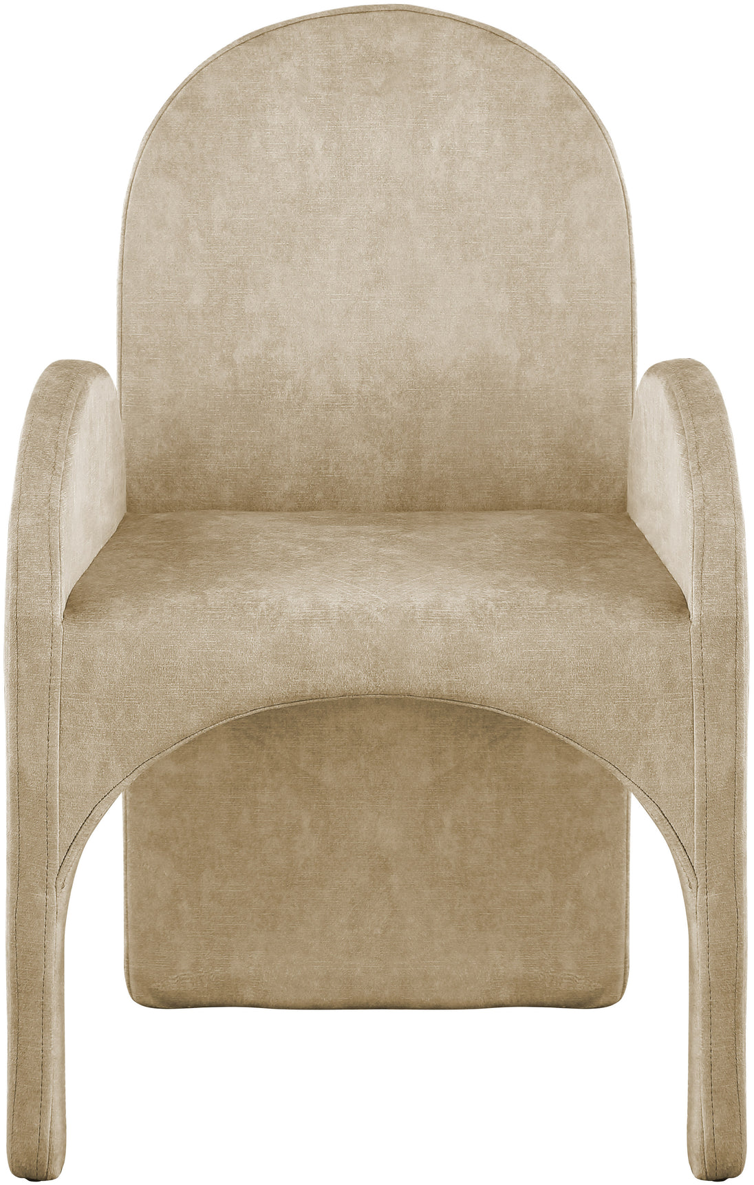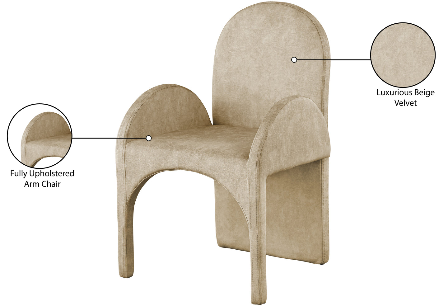 Turn your dining room into a regal haven with this Summer beige velvet dining arm chair. Featuring a luxurious beige velvet upholstery, this fully upholstered armchair offers comfort and support while you enjoy your meals. Its steel frame ensures durability, so you can enjoy the chair for years to come. Its arched, contemporary design is both unique and fashionable, providing your dinner guests with a conversation piece as well as a comfortable place to sit.