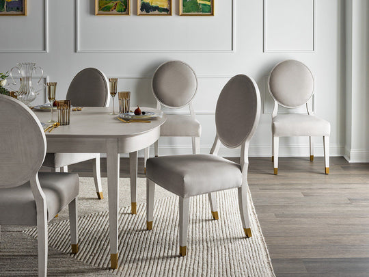Boasting an exquisite rounded back, an upholstered seat, and soft gold metal caps on each leg, the Love Joy Bliss Oval Side Chair is a luxe seating choice.Product FeaturesFinish - AlabasterSpecifications Item Depth (Inches): 25 Item...Sale price $1,539.00Regular price $2,309.00Sale price $1,539.00Regular price $2,309.00 -