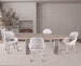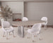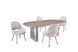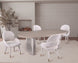 The Bode 5-Piece Dining Set in beige brings a refined modern aesthetic to any dining space with its bold yet minimalistic design. This set includes a beautifully crafted dining table and four elegantly upholstered chairs. The table features striking pedestal legs with an artistic cut-out design, finished in a sophisticated contrast matte paint that enhances its contemporary appeal. The chairs are designed with curved backrests and plush seating, offering both style and comfort. Wrapped in a soft, textured fabric, the set invites a warm and welcoming atmosphere perfect for both everyday meals and special gatherings