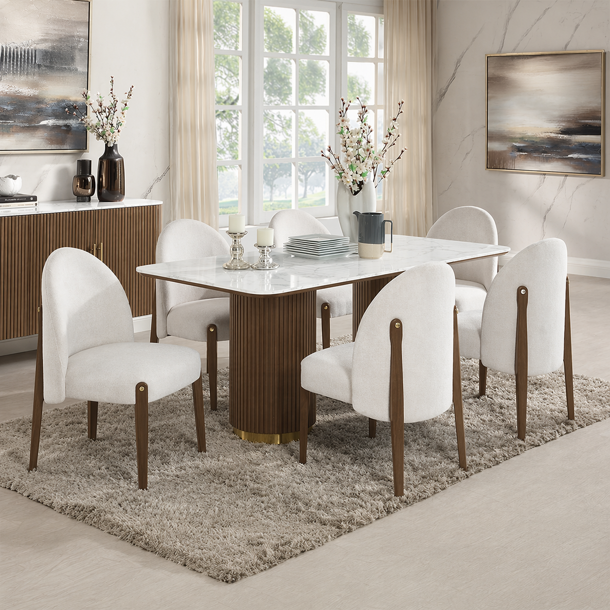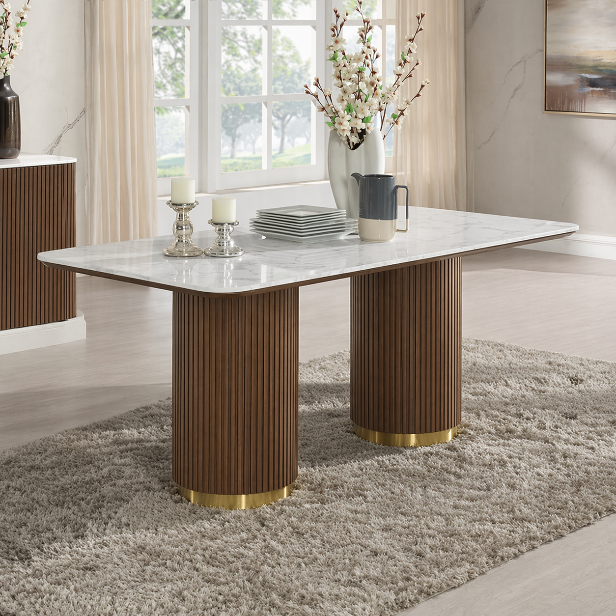 Bring refined elegance to your dining room with the Clay Dining Table. Showcasing a sleek rectangular silhouette, this statement piece features a fixed white marble top that adds a bright, luxurious feel to any space. The striking double pedestal base is accented with metal trim for a sophisticated touch, blending modern design with timeless appeal. Perfect for everyday dining or special gatherings, the Clay collection creates a polished setting for memorable meals. Pair it with upholstered dining chairs and the coordinating server to complete the look with comfort and contemporary style.