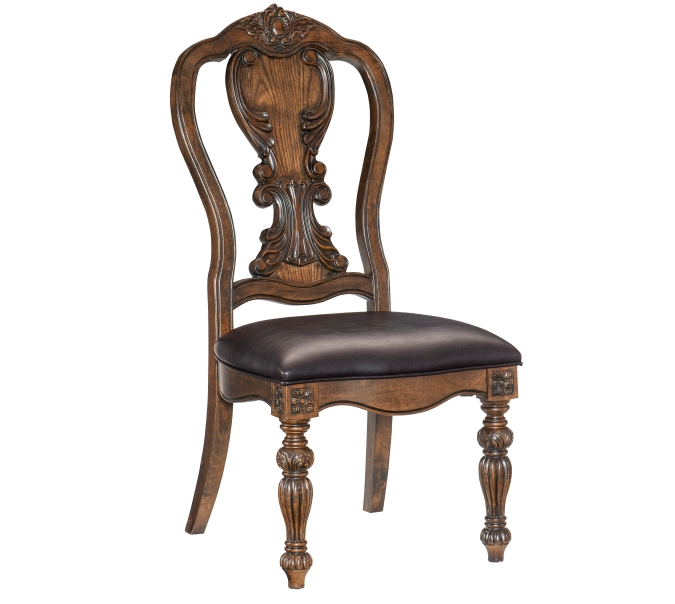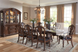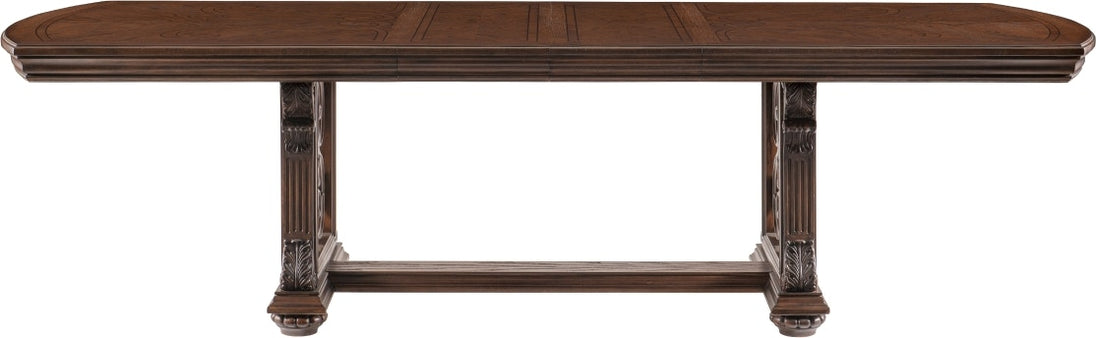 Product Description: The grand scale of the Bergen Collection invokes a timeless aesthetic for your home's traditional dining room. The dark oak finish highlights the distinct oak veneer of the collection, while also lending contrast to the decorative pattern of the tabletop's design. Traditional accenting abounds throughout the collection with classic routed pilasters, moldings, and decorative pediments gracing the table's trestle base.
