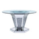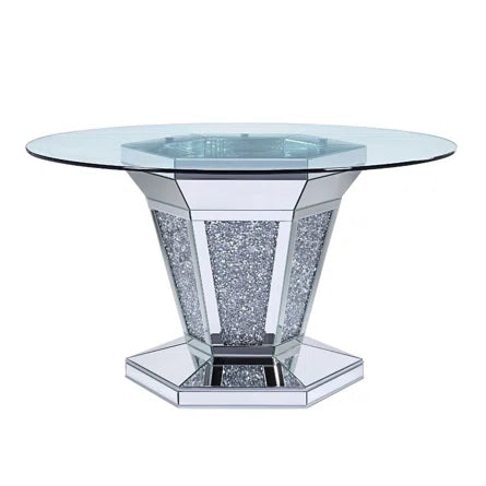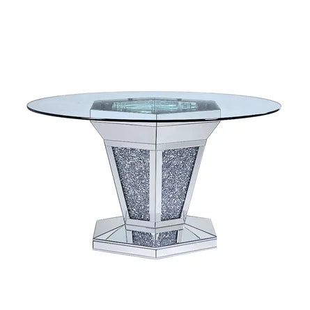 Transform the look of your dining space with this modern dinette and watch as guests compliment and admire its breath taking design. Modern style meets exquisite elegance with the Diamond Collection. The Diamond features a dining table with a beautiful clear tempered glass top that sits on a diamond studded shaped base.