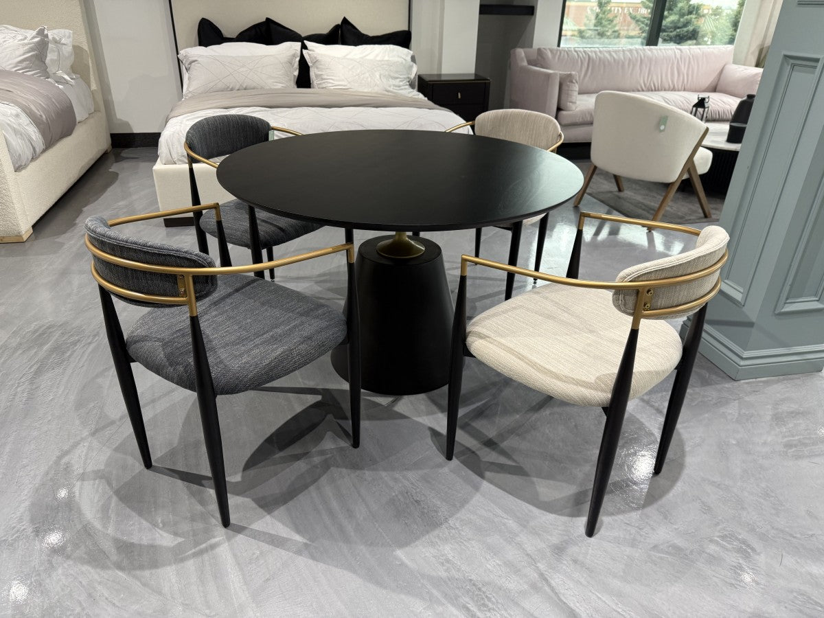 The Ambassador Dining Table in Black is a masterpiece of timeless design. Crafted with meticulous attention to detail, this dining table boasts a solid wood construction that radiates durability and sophistication. Its sleek and elegant silhouette serves as a captivating centerpiece, drawing attention and admiration from all who gather around it. Adding a touch of opulence, the table features gold finished metal accents that gracefully adorn its base, enhancing the overall aesthetic. Each piece of wood used in its construction is carefully sourced from India, ensuring the highest quality and authenticity. The Ambassador Dining Table in Black effortlessly combines classic elegance with modern sensibilities, making it a statement piece that elevates any dining space to new levels of refined charm.