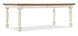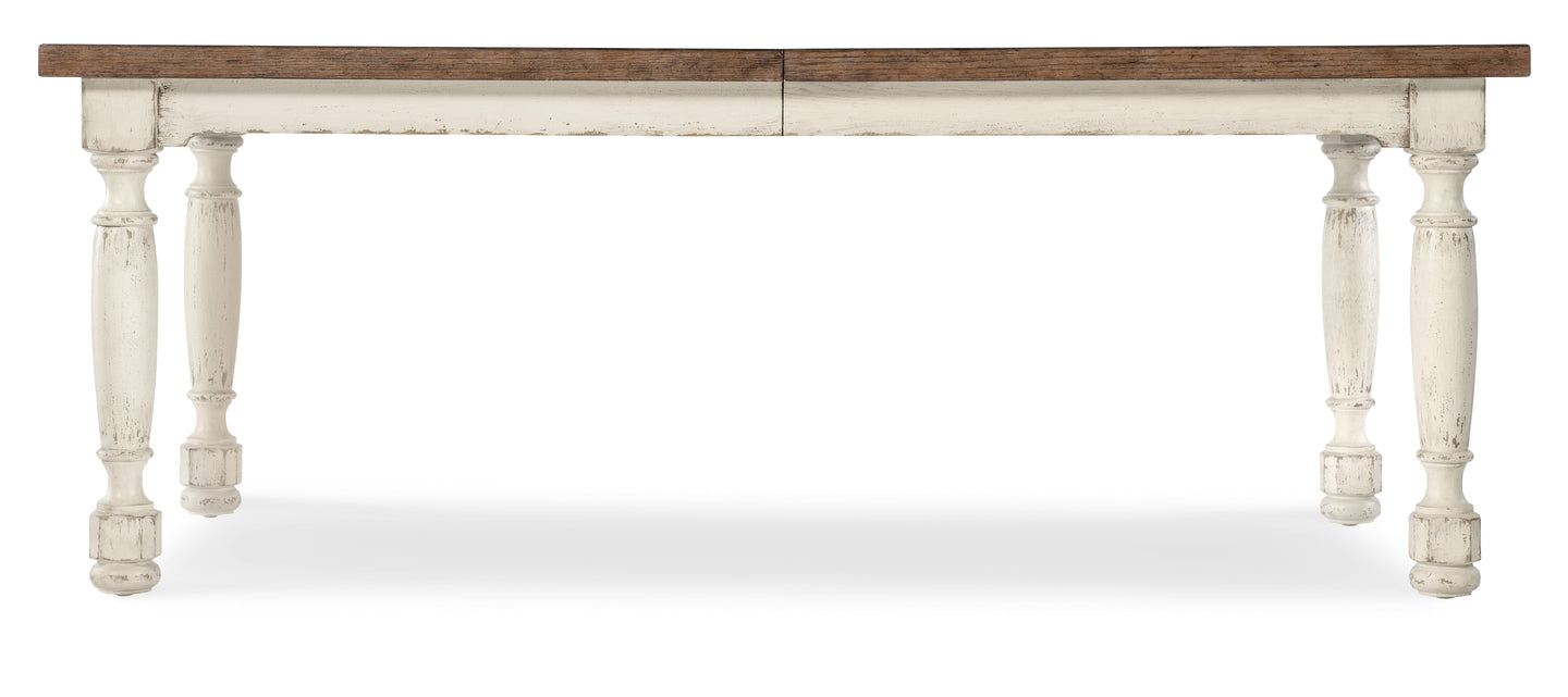 Combining the time worn white Daisy finish on the base and the warm Honey finish in a soft brown tone on the top, the Americana Dining Table harkens back to a simpler, more genteel time. Crafted of Oak Veneers with a Solid-Wood Edge Top, it has chunky turned legs and a shaped apron. What’s more, this table can be a real crowd-pleaser. With the 22-inch leaf in place, it extends to 102 inches long, accommodating up to 4 coordinating benches and two armchairs or up to 8 coordinating arm or side chairs. Without the leaf, it accommodates up to 6 coordinating arm or side chairs and up to two coordinating benches and two armchairs.