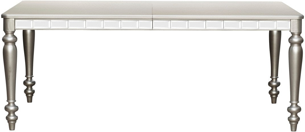 Specifications: Made of wood, engineered wood and mirror. Silver finish. Separate extension leaf. Table extends by pulling both ends and dropping in leaf. Beveled mirror trim. Seats 6. Assembly required. Prop 65 Information.