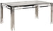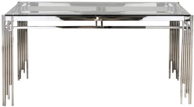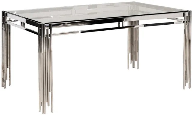 Product Description: With a profile that invokes the feeling of a city skyline, the Porfirio dining table will add dramatic character to your modern dining room. Vertical rods of varying heights in a silver metal finish comprise the exterior corner supports of this glass-topped table, creating a delightful architectural aesthetic for your dining experience.