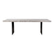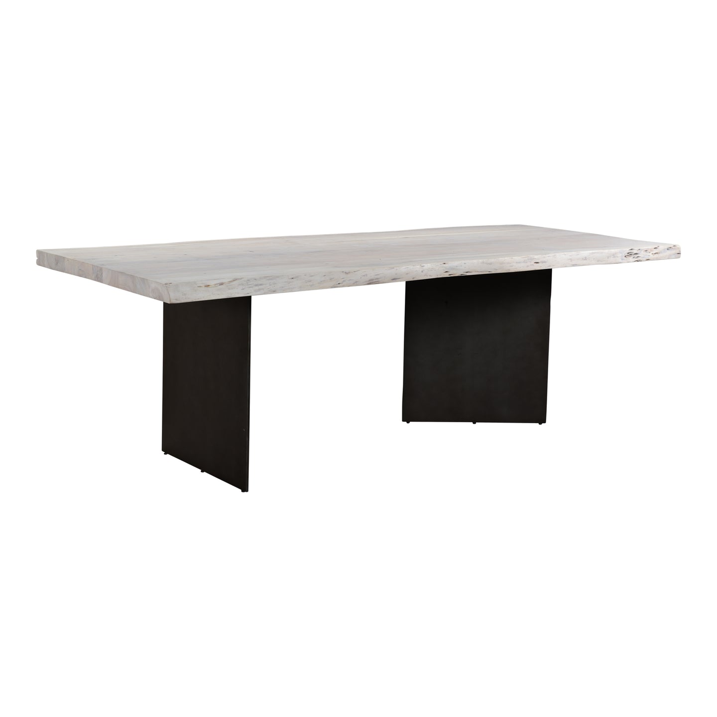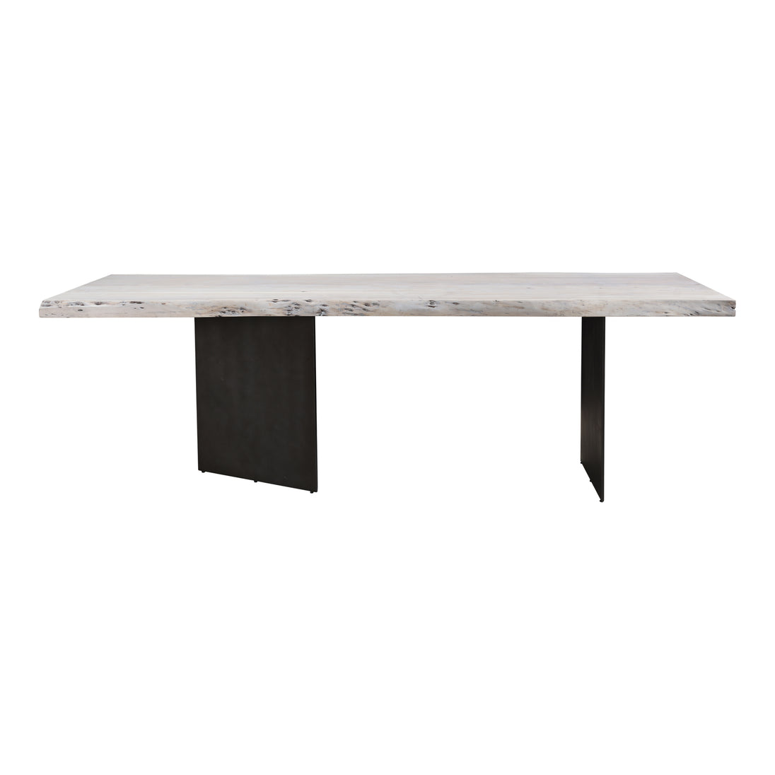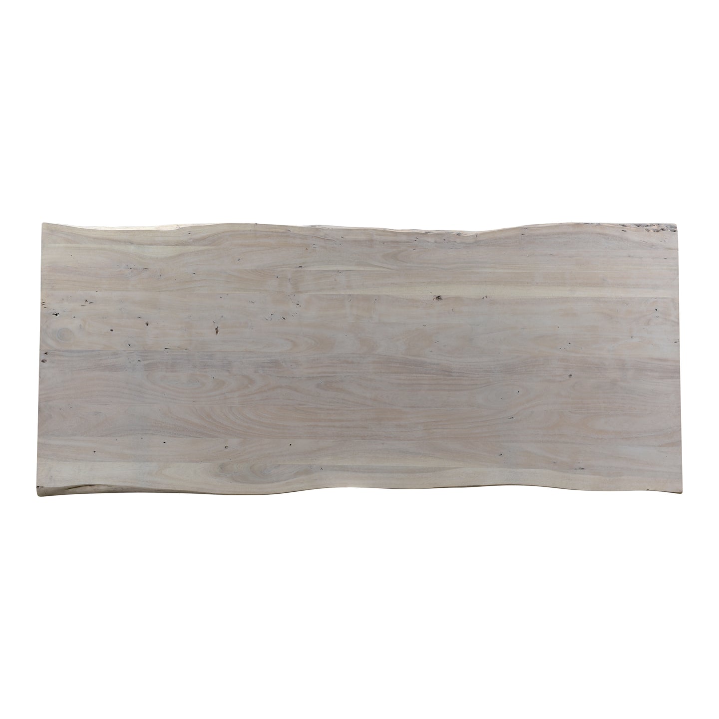 With a live edge, the Evans Dining Table is the center of the fun. Made with a white washed solid acacia wood and dark iron legs, this table features its own unique combination of knots and grains. Whether you're looking for an industrial or contemporary modern piece, this table will be the perfect fit.