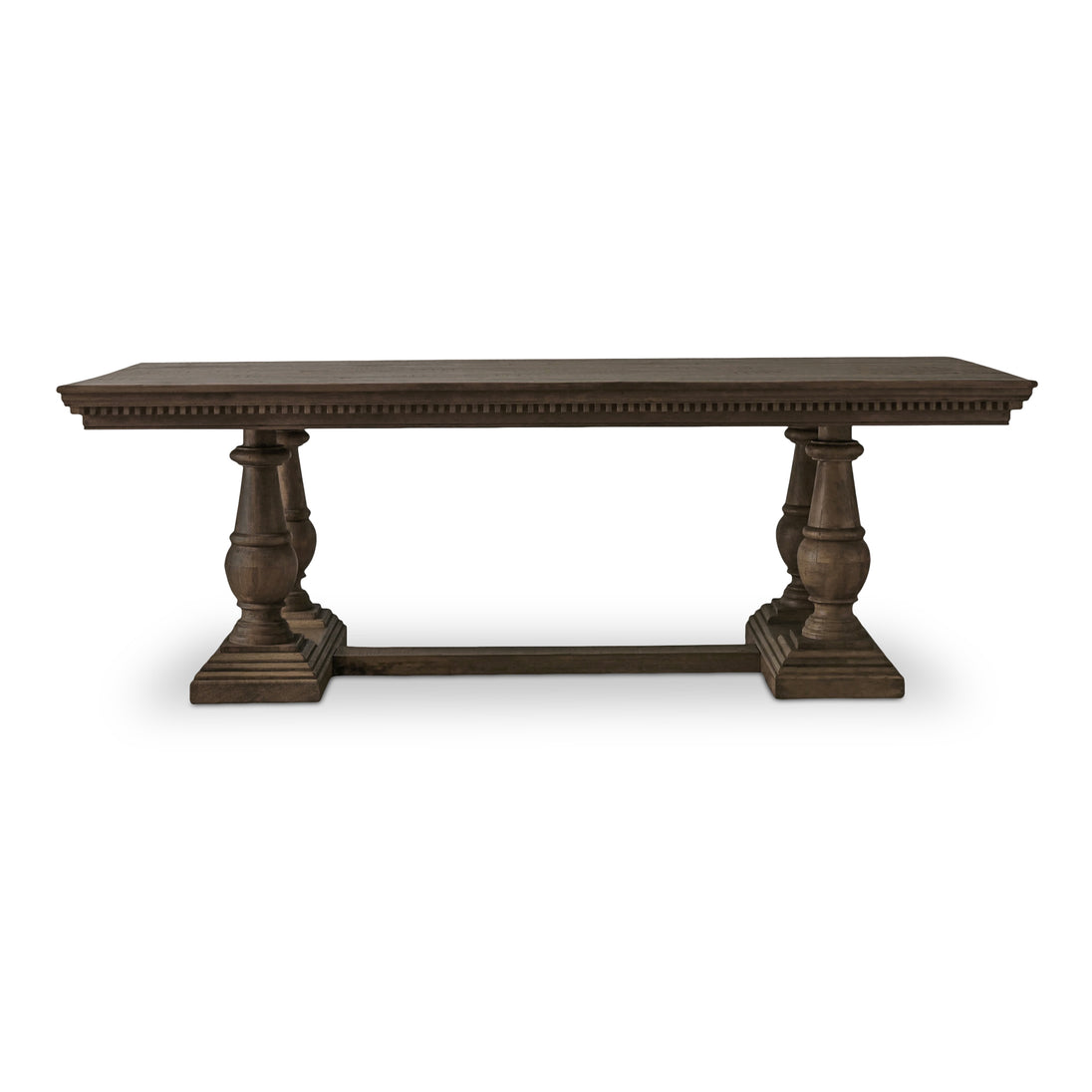 Crafted from sustainably sourced mango wood, the Everson dining table's rich brown hue showcases intricate molding and classic leg profiles with a stretcher in between. Comfortably seating 8 to 10, this generous centerpiece invites memorable gatherings as every element is an invitation to come together.