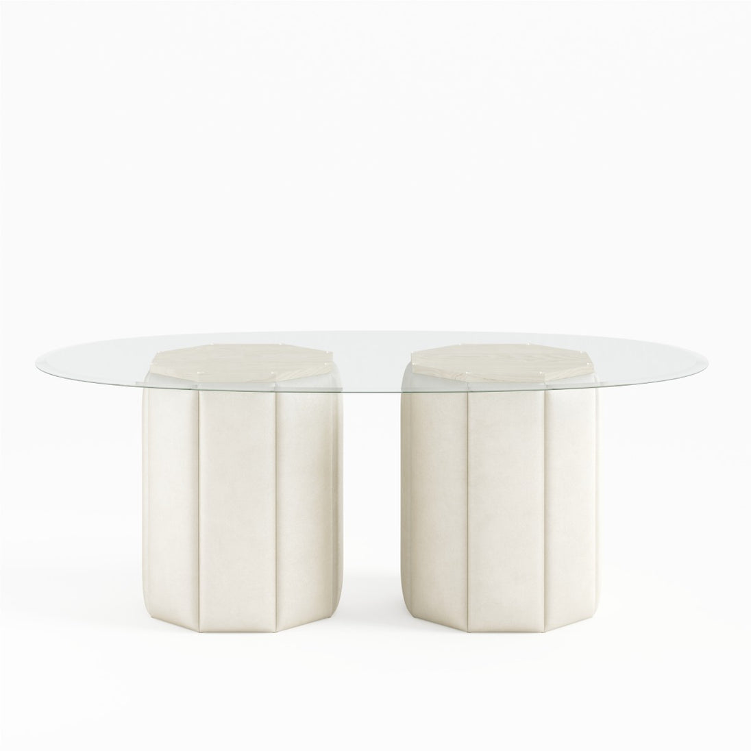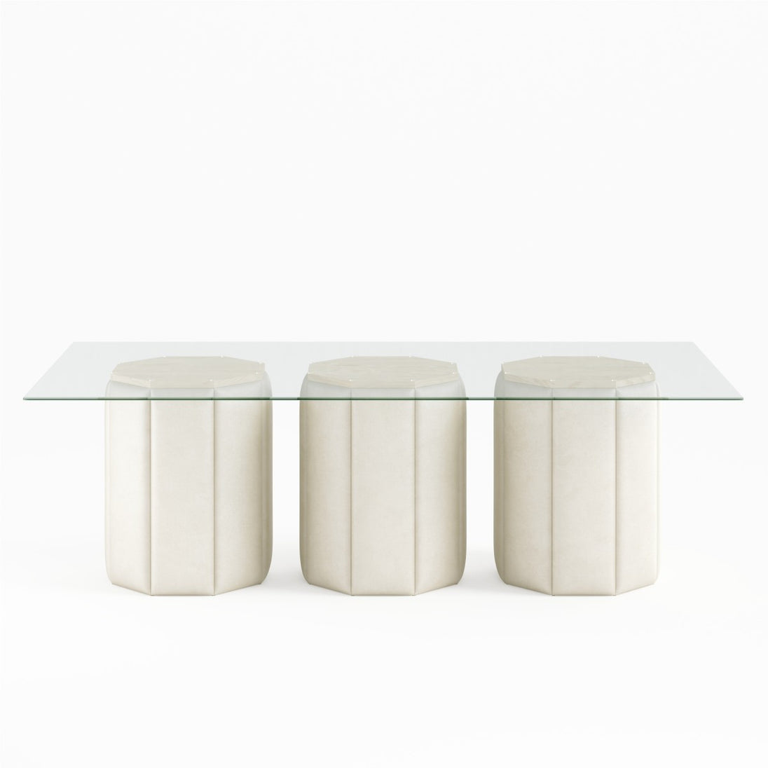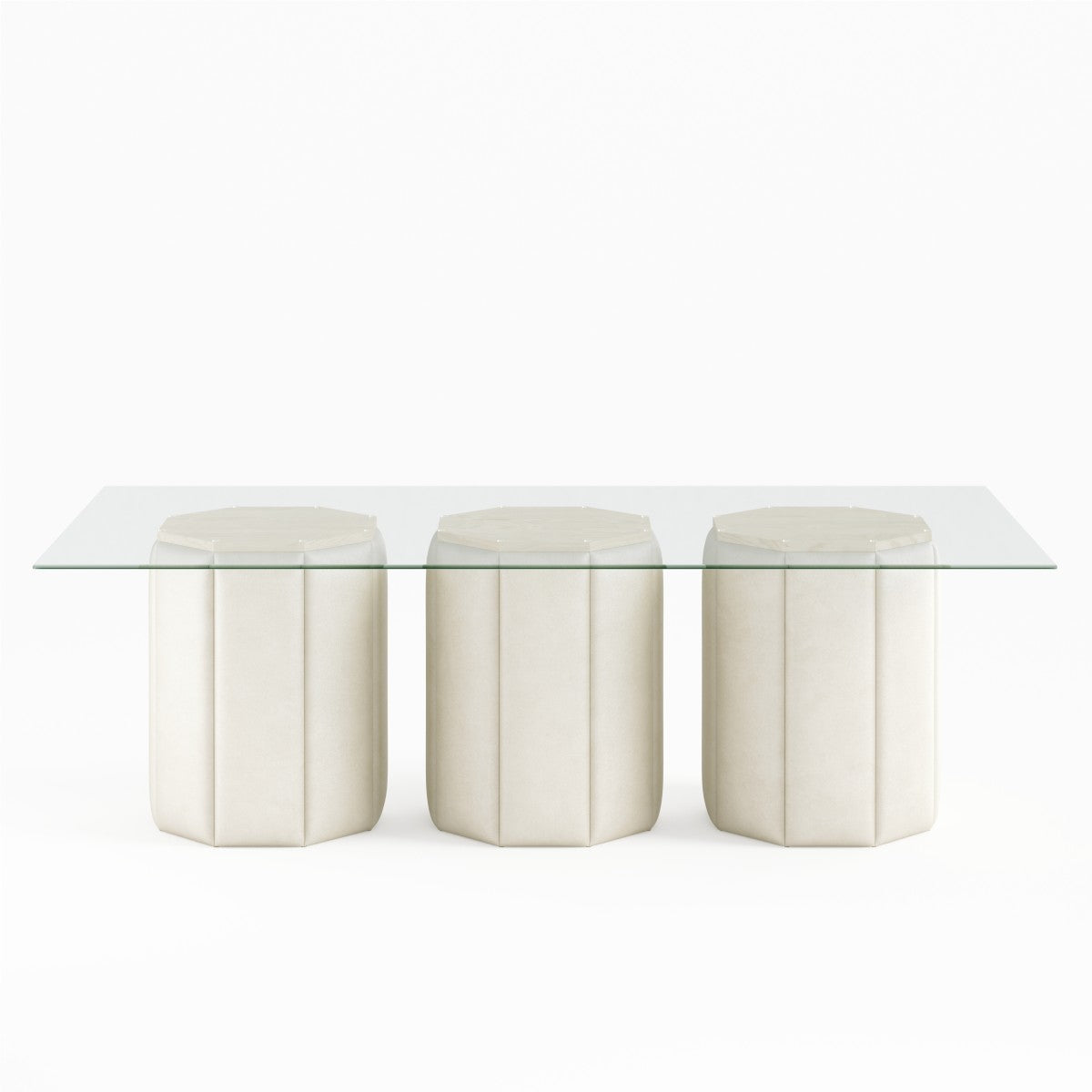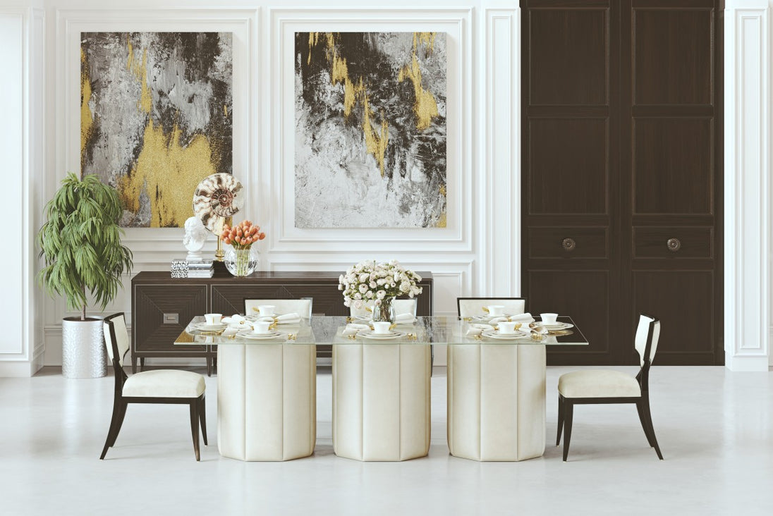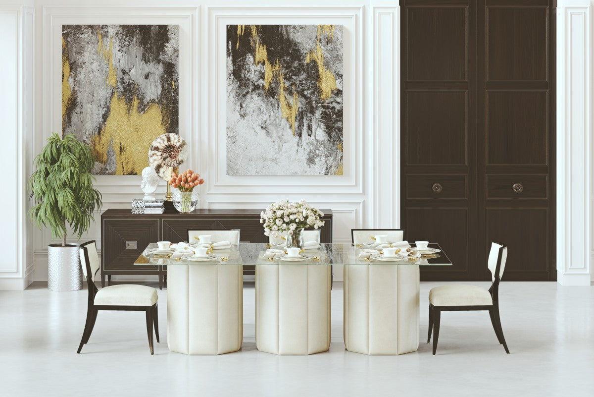 This unique dining table from Brassex is a statement-making addition to any chic modern home. The striking dinner table features an elegant tempered glass tabletop that shows off the three beautiful beige patterned bases below. The solid maple wood framework and top base support are covered in high-density foam for stability and longevity. This substantial dining room table can accommodate up to eight diners comfortably, making it a functional choice for family dinners as well as for casual gatherings and formal entertaining. Proudly made in Canada from the highest quality materials, this glass table is a durable and attractive piece designed to stand the test of time with style.