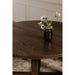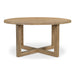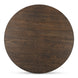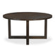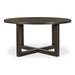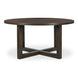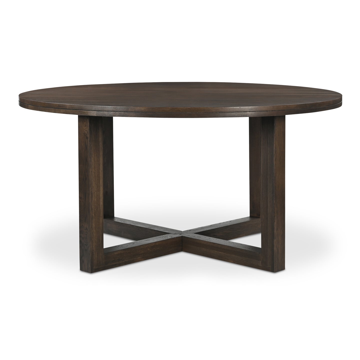 Crafted from solid oak, the Joel dining table's 40mm thick round top features a thoughtfully crafted V-groove, adding a visual lightness to the substantial surface. The geometric base, with crisscrossing stretchers, grounds the piece with quiet confidence. A dark brown, wire-brushed finish enhances the oak's natural beauty, creating a focal point of understated elegance.