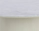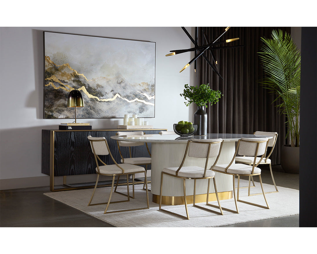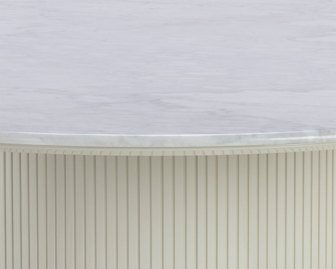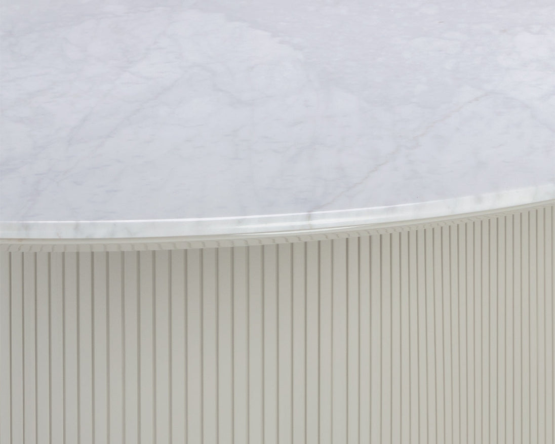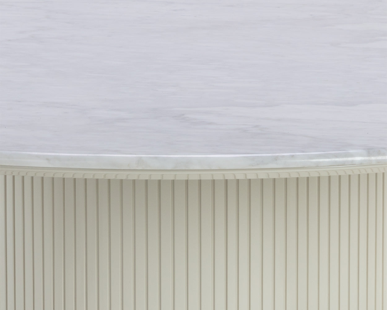 The Paloma Dining Table brings a sculptural spirit to any dining space. The smooth white marble tabletop contrasts with a textured high gloss cream base that features intricate vertical reeding. A gold stainless inlay at the bottom creates added definition. As marble is a natural material, unique veining, pitting, fissures, micro-cracks and colour variations are all characteristics that add to the uniqueness and beauty of each piece.