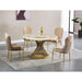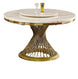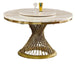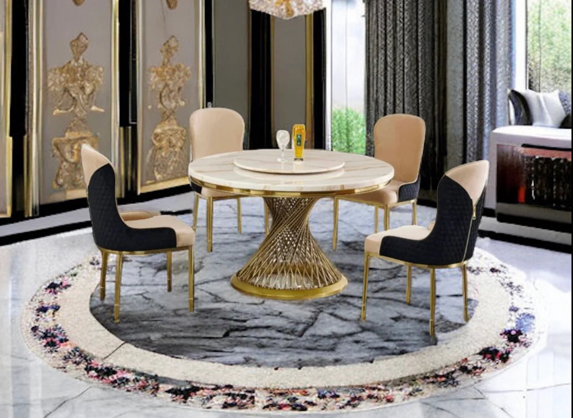Introducing our Marble Top Dining Table, a sophisticated addition to your dining room that blends classic elegance with modern design. The table features a luxurious marble top that adds a touch of refinement and durability, perfect for hosting gatherings and meals with style. Its stainless steel base is adorned with a gold finish accent, providing both stability and a glamorous aesthetic that complements any decor. The gold ring base further enhances its visual appeal, creating a cohesive look that exudes opulence and contemporary flair. Whether for everyday dining or special occasions, this dining table promises to elevate your dining experience with its impeccable craftsmanship and timeless allure.