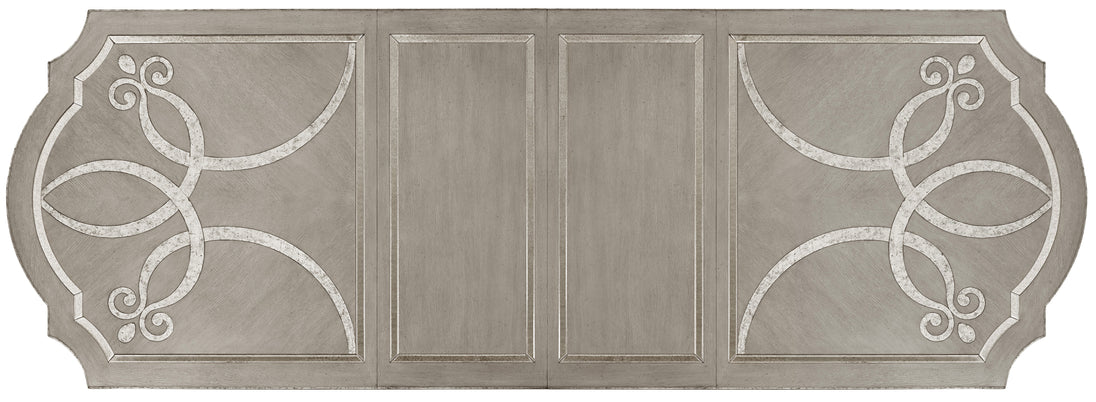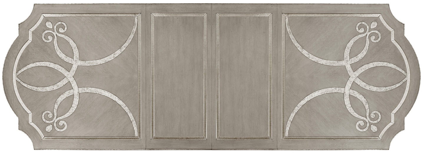 Make every dining gathering a luxe experience with this opulent dining table featuring exquisite scrolled inlays on the top and a mirrored apron. Finished in Epoque, a greige with shimmer on Oak veneers with mirrored accents. Seats 10 guests and extends to 128 inches with both leaves in place.