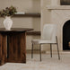 The Stanley dining table features a unique cross base with artfully carved arches at each end that lend an airy feel to its robust construction. Crowned with a solid mango wood top that showcases natural grain patterns unique to each piece, it offers a durable, smooth surface ideal for daily dining and entertaining. The mango wood construction grounds the piece, making it a versatile fit for diverse interior styles.