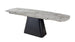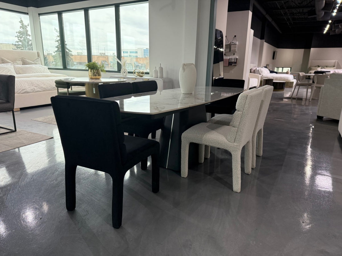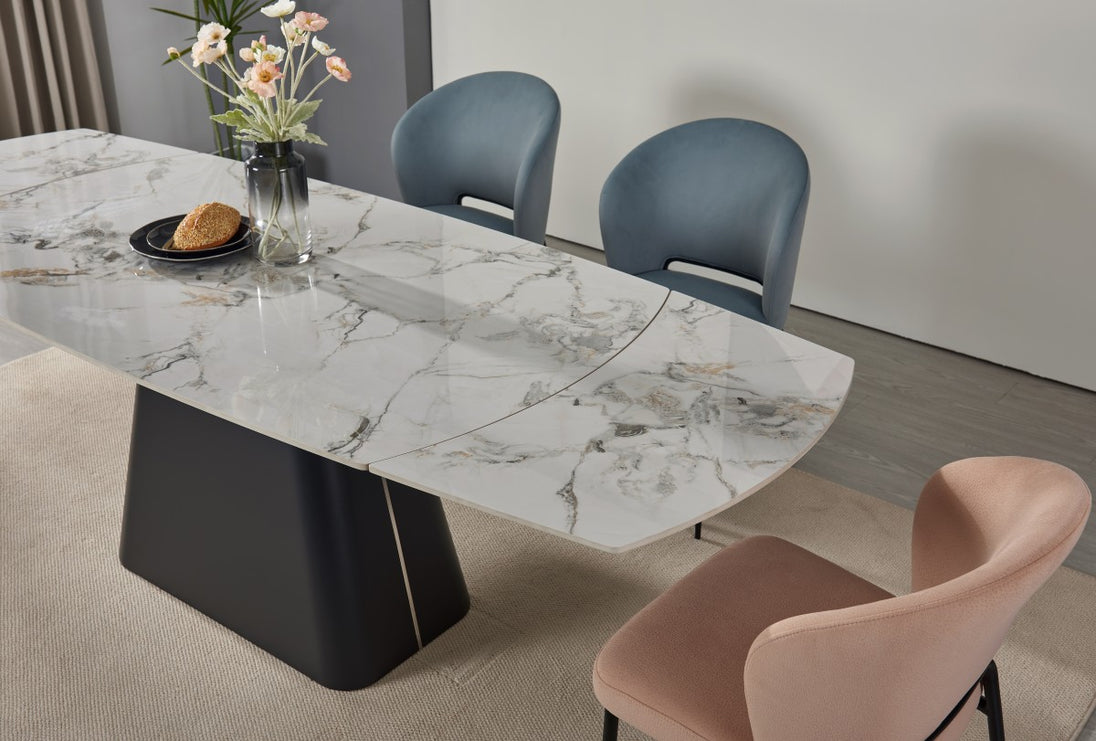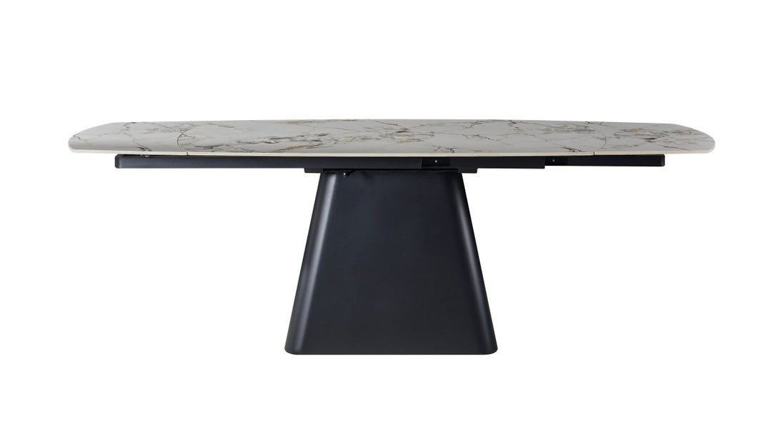 The Calliope Dining Table in Jadeite White, a stunning blend of contemporary design and superior craftsmanship. This elegant table features an 11mm sintered stone top in a beautiful jadeite white color, enhanced by cascading veins that add a touch of natural artistry. Supported by a black powder-coated metal frame and legs, the table offers both stability and a sleek modern aesthetic. The Calliope Dining Table is also equipped with a rotating middle mechanism and dual 16-inch extensions, providing a versatile and expandable dining surface. Perfect for both intimate dinners and larger gatherings, the Calliope Dining Table is designed to elevate any dining space with its sophisticated style and functionality.