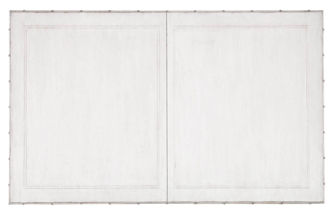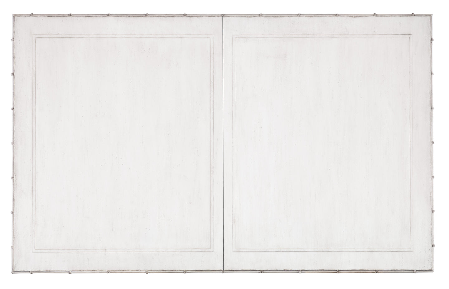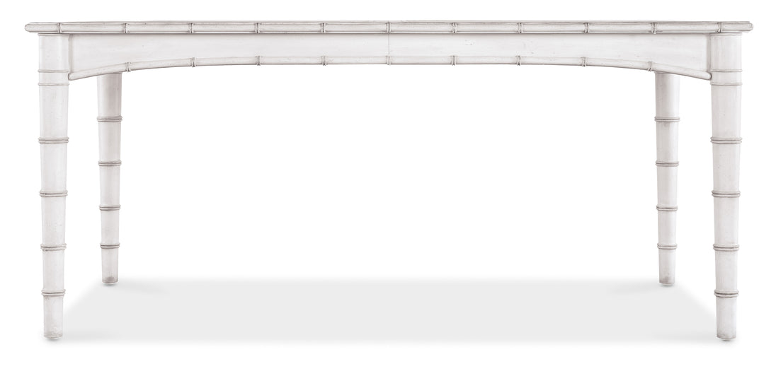 Capturing the vintage charm of the coastal South and the tropical craftsmanship of the West Indies, the Charleston Rectangle Dining Table has bamboo-motif accents and slender bamboo-style legs. The wood table has a Solid Wood Edge Top and is finished in White Heron, a softer interpretation of the classic Southern limestone white with a slightly brighter sheen, delivering an heirloom-quality finish. With one 20-inch leaf in place, the table extends to 88 inches long. The table accommodates 4 side chairs and two arm chairs without the leaf and 6 side chairs and two arm chairs with the leaf.