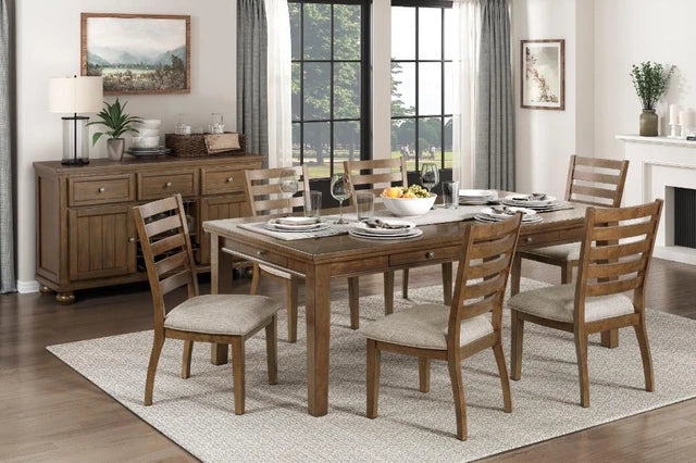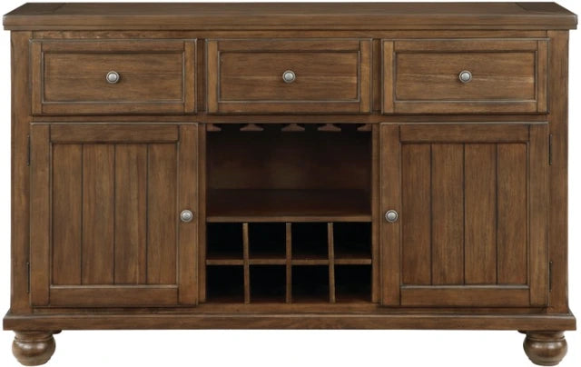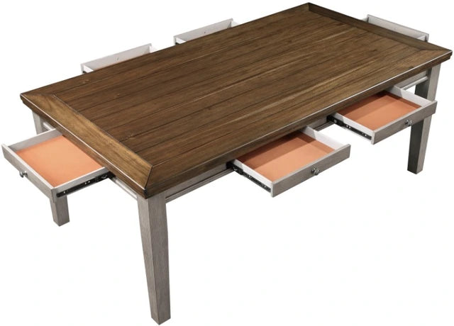 Product Description: The traditional styling of the Tigard Collection lends timeless appeal to the look of your casual dining space. With subtle hints nodding to the Arts and Crafts design movement, the framed plank tabletop features classic lines that solidify the versatile aesthetic of the collection. A traditional two-tone cherry and gray finish is utilized to highlight the collection's acacia veneer.