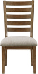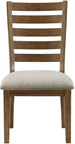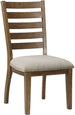 Product Description: The traditional styling of the Tigard Collection lends timeless appeal to the look of your casual dining space. With subtle hints nodding to the Arts and Crafts design movement, the ladder-back side chair features classic lines that solidify the versatile aesthetic of the collection. Covering the padded seats of the side chairs is a neutral tone fabric upholstery, complementing the traditional two-tone cherry and gray finish of the chair's wood veneer.