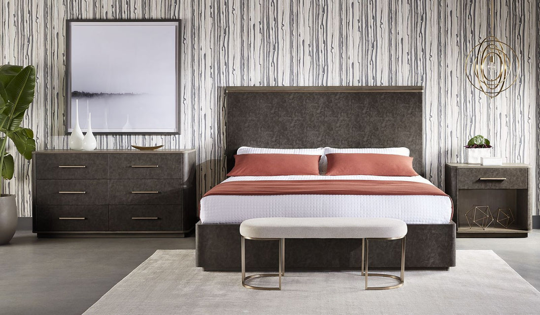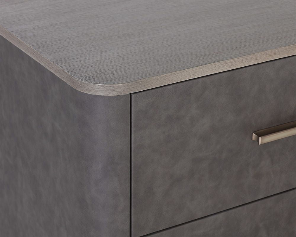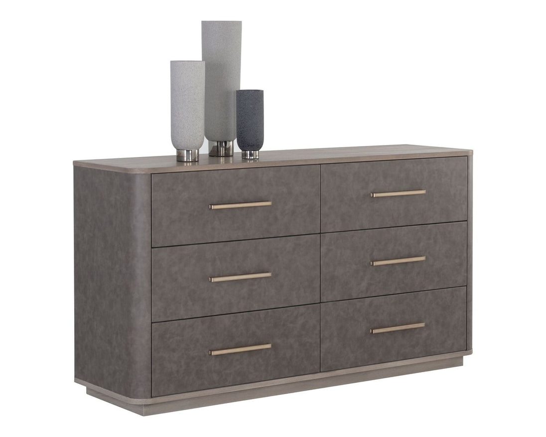 Add character to any space with this retro inspired dresser crafted in Vietnam. Designed with a faux leather wrapped frame and six soft closing drawers. A dark grey oak veneer wood top and brass stainless steel hardware complete the look. Can be paired with coordinating bed, nightstand and desk.
