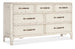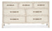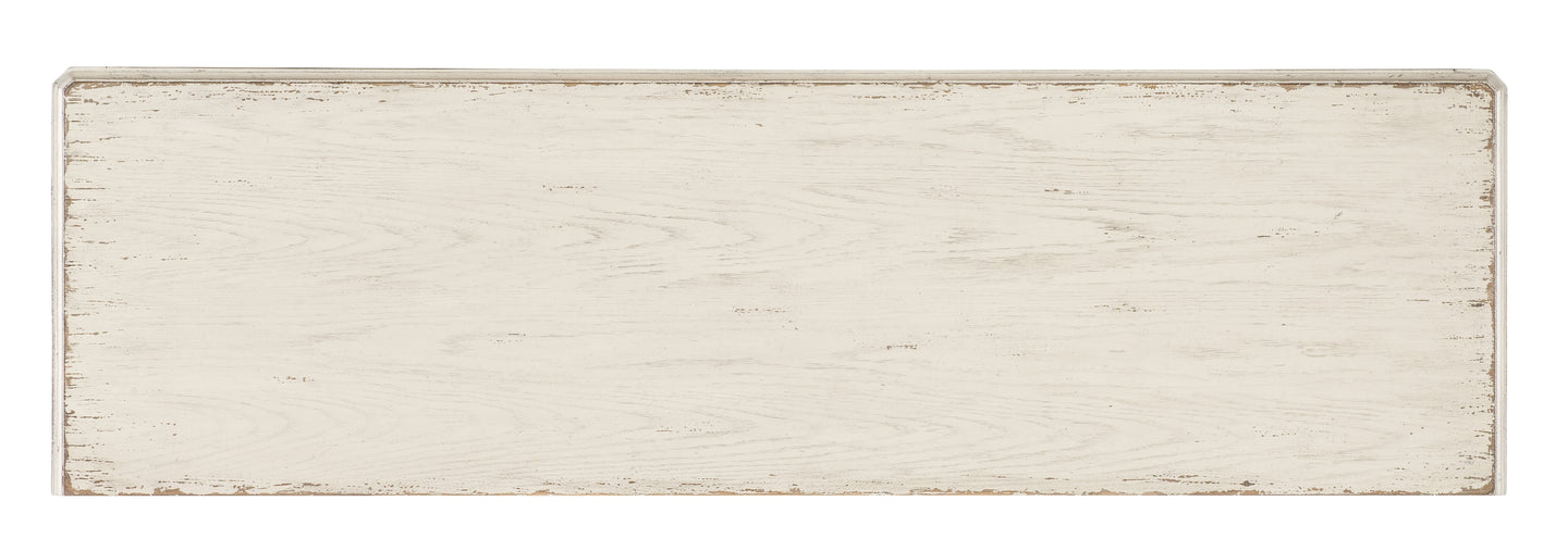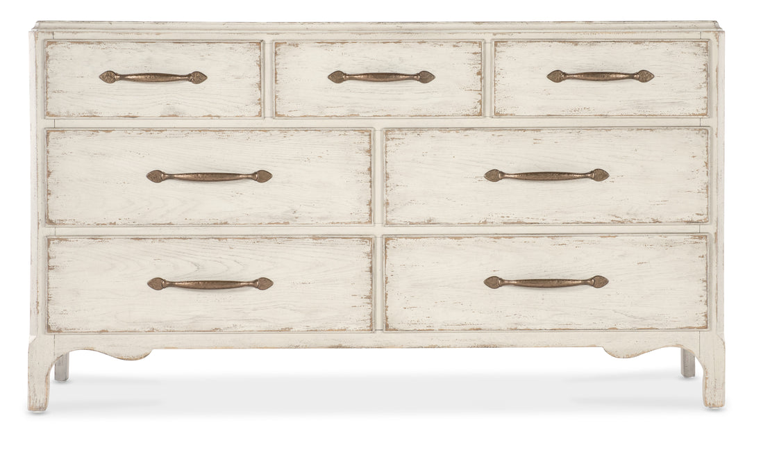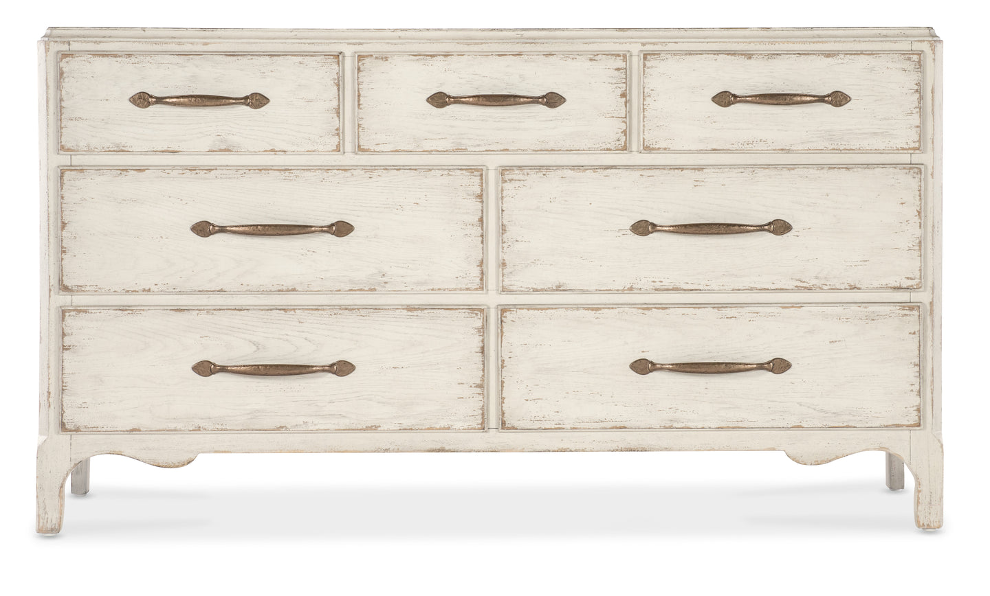 In a classic, charming design with a nostalgic flair, the American Dresser is crafted of Oak Veneers with a Solid-Wood Edge Top, a scalloped-shape base and finished in the time-worn white Daisy. There are 7 self-closing drawers, with the top left and right drawers with black removable felt liners. The center drawer has a black liner and black removable jewelry tray. The bottom two drawers are cedar-lined. Metal alloy pulls are in an antique bronze finish.