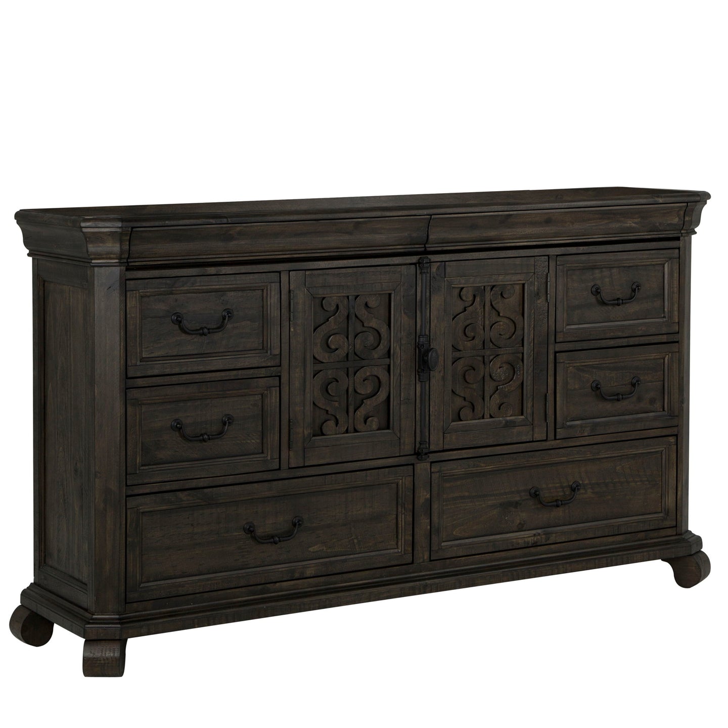 Warm and inviting like an old French friend, Bellamy welcomes with European inspired styling in a unique Peppercorn finish and matte black pewter accented hardware. Scrolling open woodwork adorns the well appointed media chest doors while roomy dressers and chests feature rounded corners atop rounded bun feet. A plethora of bed options offer upholstered tufted headboards, storage footboards, panel headboards and gorgeous shaped panels with or without sumptuous scrolled design work for a Chateau feel for any taste.