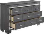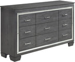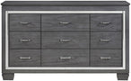 Product Description: Glamour reigns in the design of the Allura Collection. Framing the dresser is a decorative beveled mirror accent that enhances the illumination from the under-light of the nightstand. High polished crystal-enhanced hardware boldly accents the gray finish.