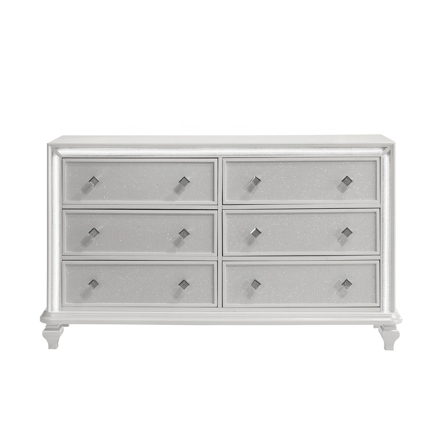 Introducing the Stardust Dresser, a statement piece that embodies modern luxury and timeless elegance. Crafted with meticulous craftsmanship, this dresser is constructed from durable manufactured wood, featuring an eco-friendly decorative laminate and UV coating for long-lasting quality. The sleek finish is gracefully complemented by glamorous silver accents, adding a touch of sophistication to any bedroom decor. Adorned with sparkling Poly/Cotton fabric and shimmering crystal hardware, this dresser exudes opulence and charm. Illuminate your space with the integrated LED lighting, enhancing the enchanting ambiance of this captivating piece. Inside, the drawers are meticulously designed with English dovetail joinery, full extension glides, finished interiors, and felt-lined top drawers, ensuring both beauty and functionality. With diamond-style accents, silver mylar trims, and accent lighting, the Stardust Dresser is the epitome of modern indulgence, perfect for those seeking unparalleled sophistication in their bedroom sanctuary.