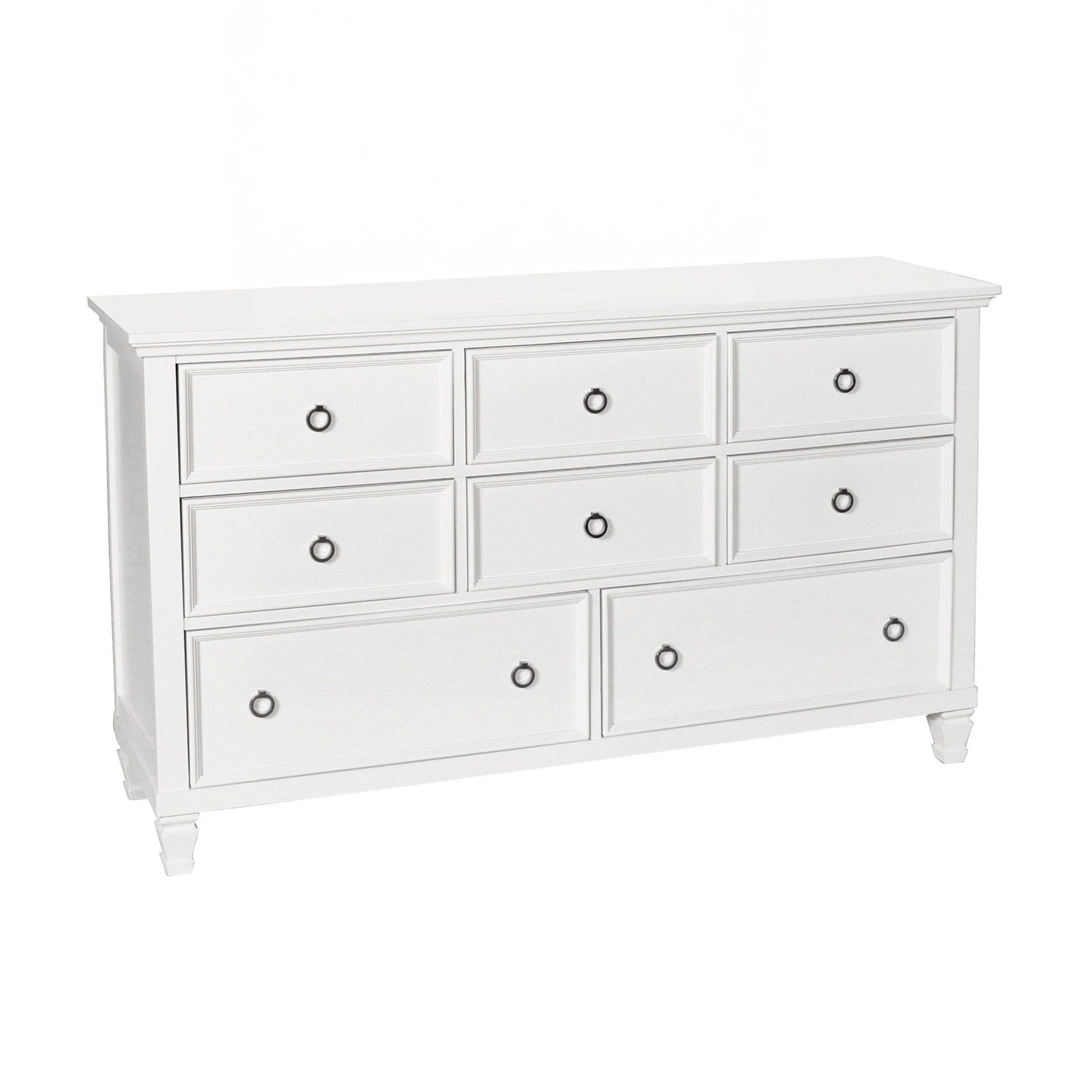 The Tamarack 8 Drawer Wood Dresser offers a perfect blend of durability and style. Built with a combination of solid poplar, basswood veneers, and eco-friendly manufactured wood, this dresser ensures strength and long-lasting durability. Its versatile transitional design combines contemporary clean lines with classic paneled detailing, seamlessly blending modern and traditional aesthetics. The elegant finish adds a touch of sophistication and modernity, enhancing the overall aesthetic and complementing any decor style. Quality drawer construction guarantees smooth operation with side-mounted glides and the durability of English dovetail joinery on both the front and back, ensuring long-lasting use. Fully finished drawers provide snag-free storage, while the felt-lined top drawers protect your delicates. This dresser is an excellent addition to any bedroom, offering both style and functionality.