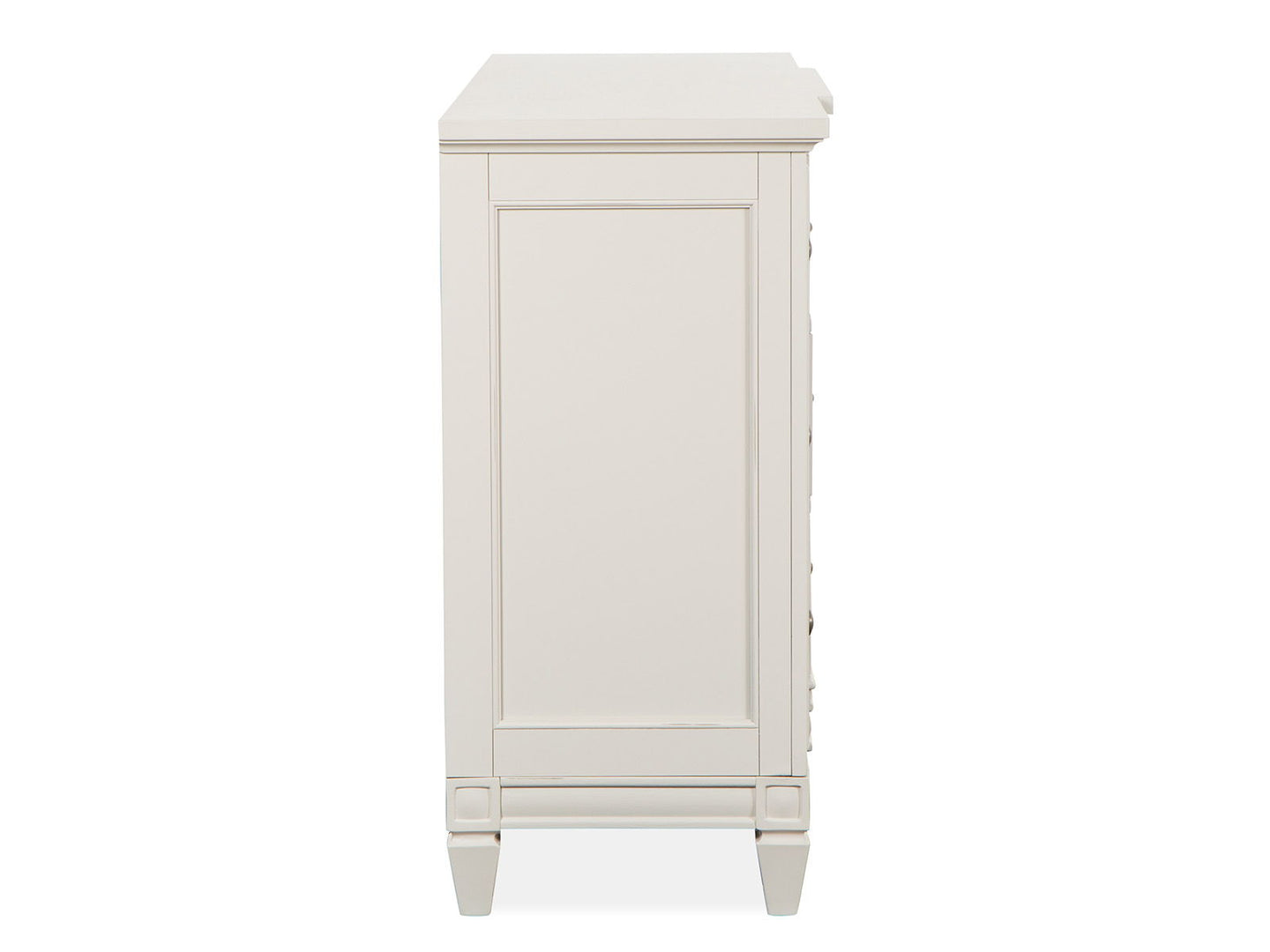 Charming and chic and Willowbrook combines a soft and casual Egg Shell White finish with classic forms to create a soothing atmosphere that relaxes mind and body. Create a serene setting with vintage silhouettes featuring breakfront shaping on the dresser and panel headboard and mirror and and tarnished silver hardware including a decorated knob and elegant bail pull. Crafted from Birch veneers and hardwood solids with a subtle gray wash over the creamy finish and Willowbrook is at home in settings from cottage to coastal and from traditional to soft modern. The stunning panel bed has a storage footboard option with two drawers and is also available with a wood-framed upholstered headboard. Two nightstand options are offered including a two-drawer nightstand and a one-drawer nightstand with two shelves. The functional door chest has a sliding wood door with wood shelves behind and five left drawers with a felt-lined top drawer and one bottom drawer to maximize storage. From beaches to the countryside and Willowbrook is a relaxing destination for the end of each day’s journey.