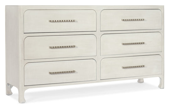 Inspired by casual waterfront living with a chic sophistication, the Serenity Dresser is crafted of Wood and Raffia and finished in Sand Dollar, a white lacquered grasscloth. Chow-style legs and light champagne-colored decorative bar pulls add...Sale price $4,689.00Regular price $7,033.50Sale price $4,689.00Regular price $7,033.50