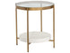 Incorporate an air of understated elegance into your designs with this end table. A beautiful round glass top and white concrete shelf are supported by a brushed antique brass finished steel frame. Can be paired with matching coffee table.