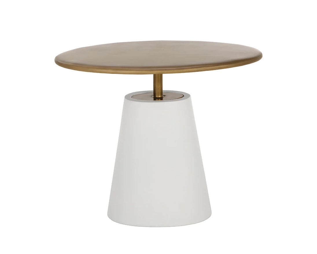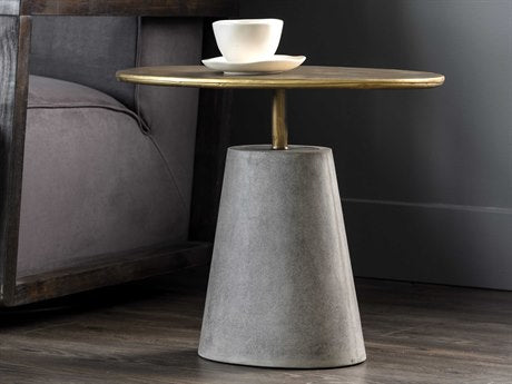 This unique side table will bring a bold yet warm look to living, lounge, and bedroom spaces. Features a dramatic grey concrete base with a brushed brass metal oval top.