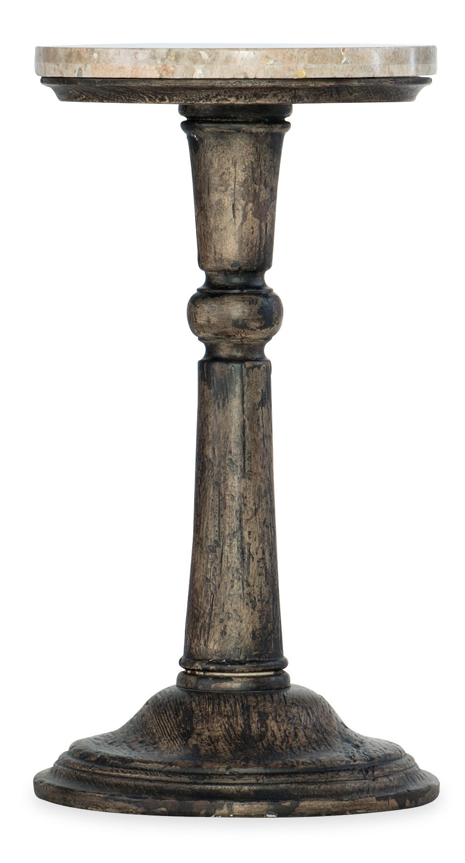 A perfect perch for refreshment at the end of a tiring day, the Rabbs Prairie Martini Table contrasts a shaped base finished in a dark Flemish paint with a stone top for an eclectic look. Offered in a convenient compact footprint, only 14 inches wide.