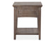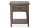 Paxton Place - Rectangular End Table. 1 drawer. 1 fixed bottom wood shelf. Tinted drawer with french dovetail in front & english in back. Side mount ball bearing guides. Floor protectors.