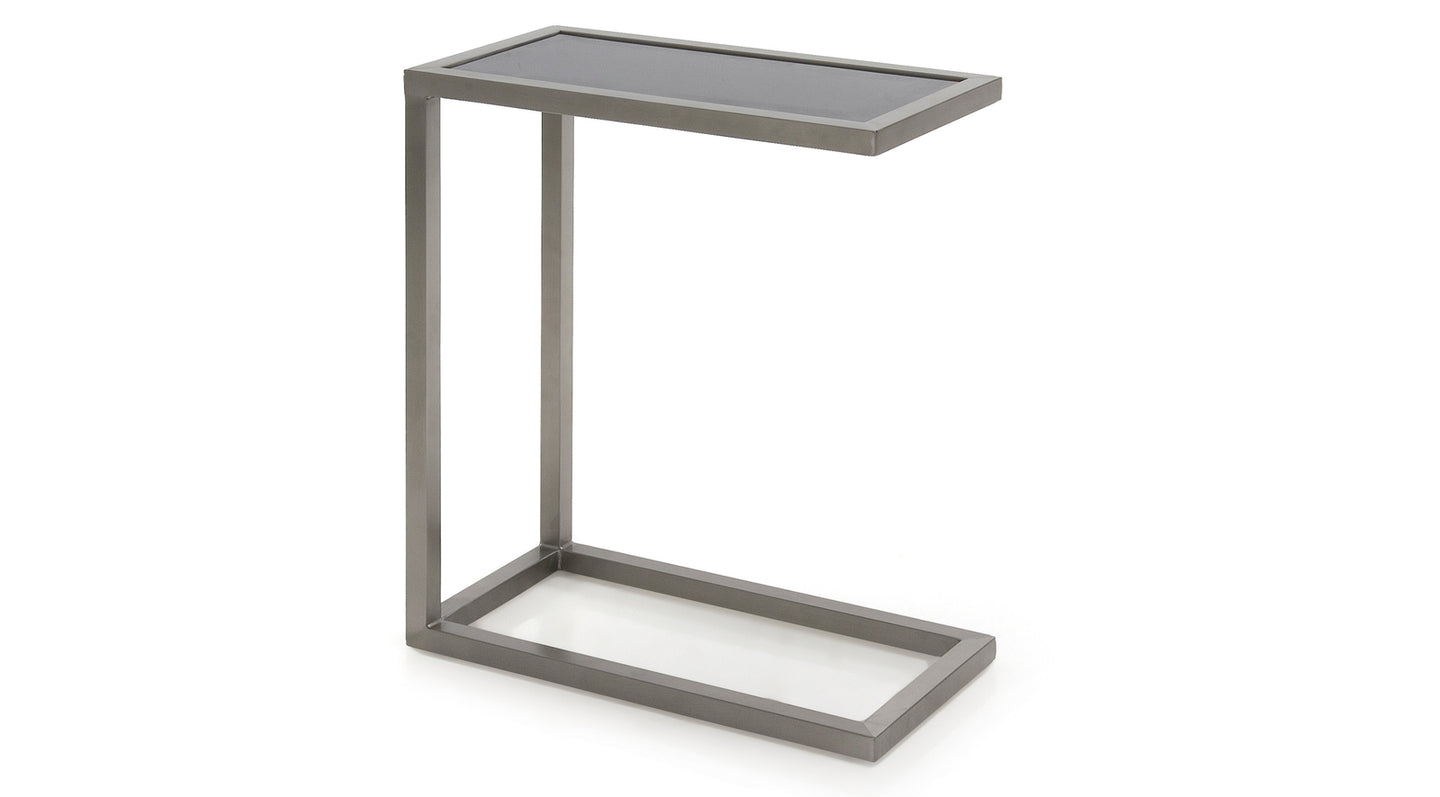 The Santo Side Table combines sleek design with practical function. Its rectangular shape is perfectly designed to nest over any sectional, sofa, or chair. Featuring a black-tinted tempered glass top and a brushed stainless steel frame, this piece adds modern elegance to any living space.