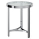 Stylish round chrome-finished table. Sturdy, thick frame has beautifully overlapping curved stretchers. Tempered clear glass is a classy compliment to the chrome. The airy feel of this table is perfect for a casual or formal space. Pair this with the matching coffee table or try placing it in a hallway or bedside.