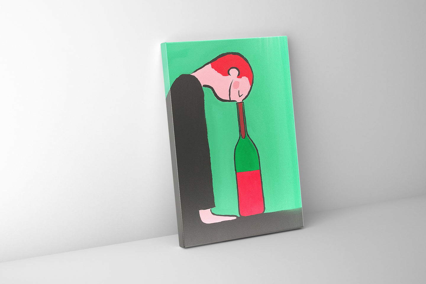 This canvas captures the essence of pleasure and the delicate characteristics of wine. With this watercolor of an expectant human taster with his long nose from Pinocchio, the basic colors add a touch of fun while still focusing on the human form enjoying the qualities of a fine wine.
