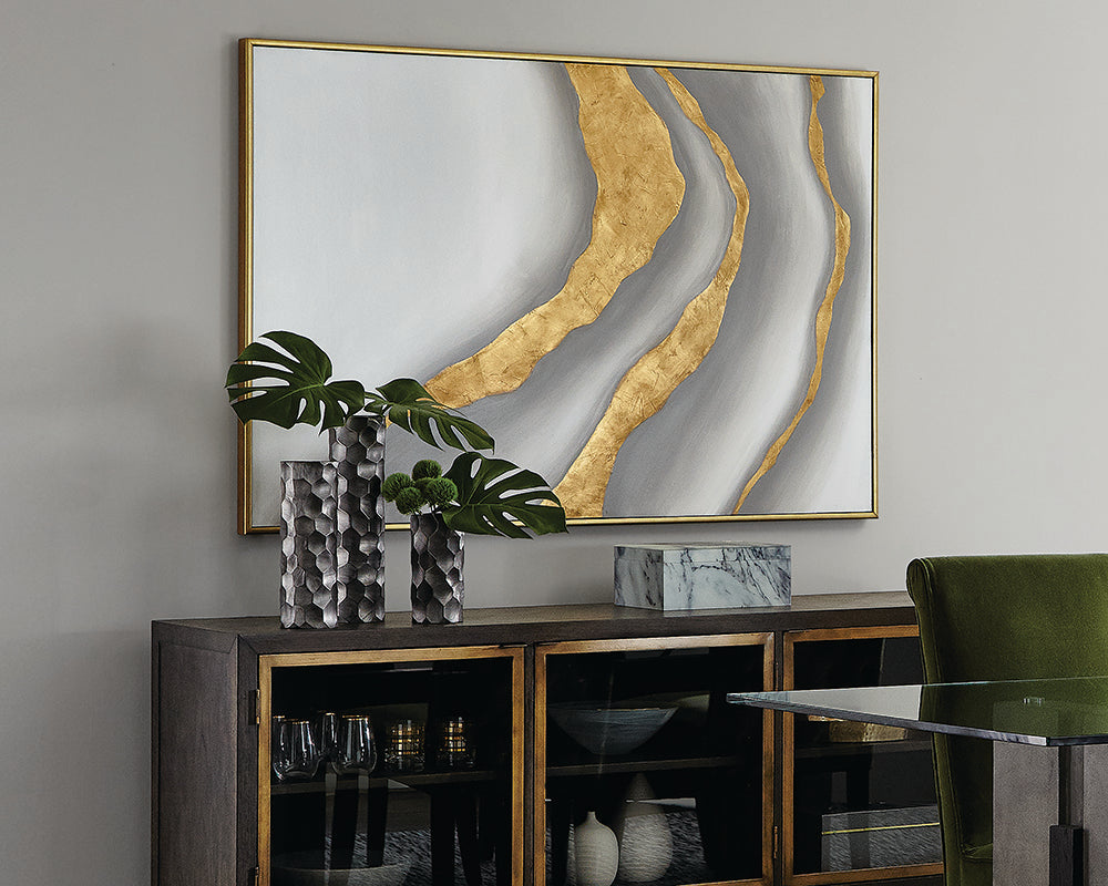 This diptych style painting features dramatic gold strokes resembling organic marble veining, creating a stunning visual effect. Features a gold finished floater frame. Each artwork is hand-painted and will feature slight variations that make every piece unique.