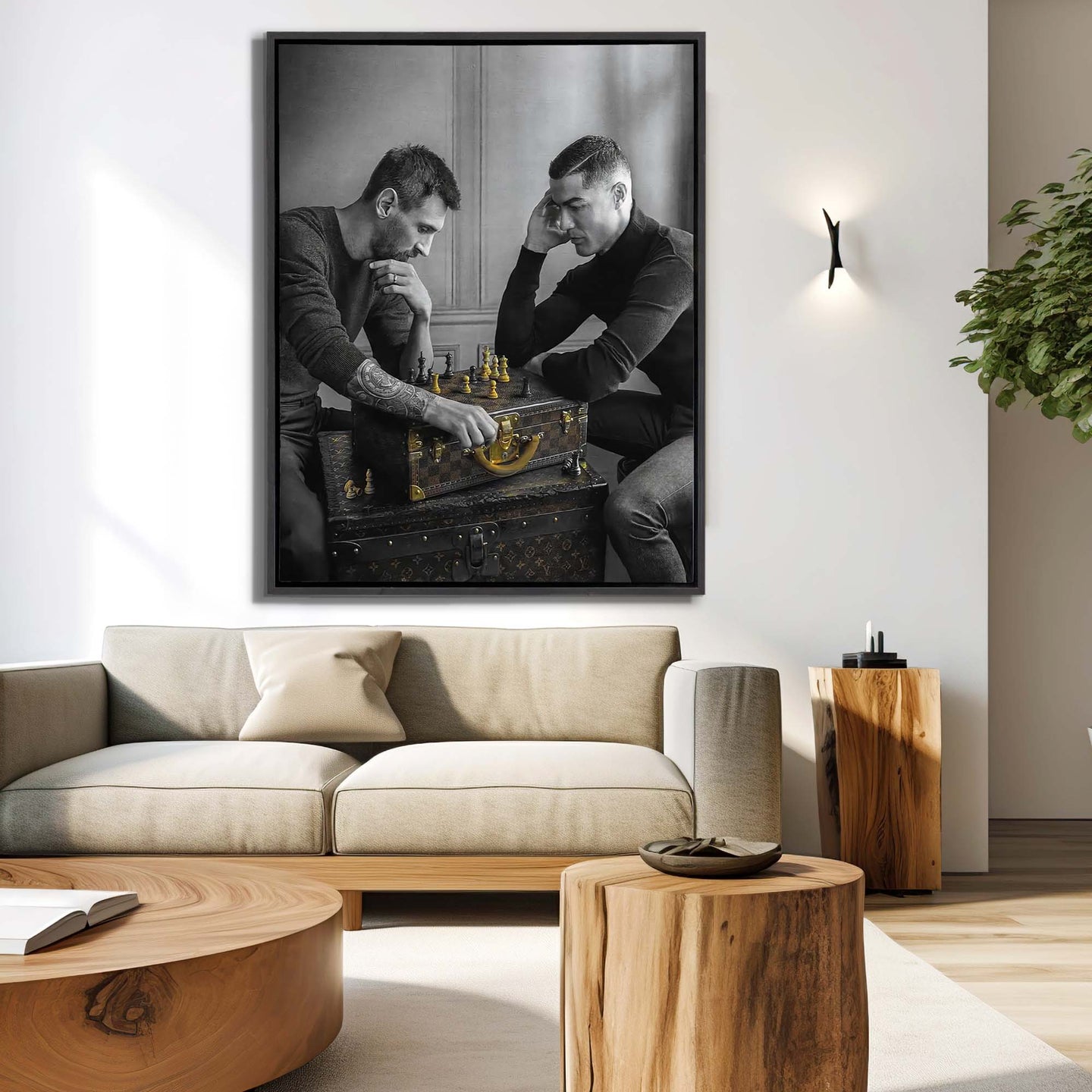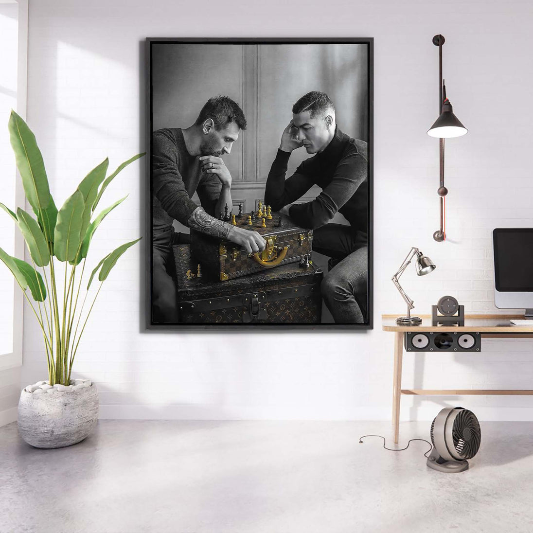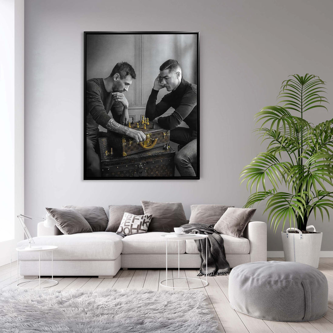 Witness the epic rivalry between two soccer legends, Messi and Ronaldo, captured in stunning detail on this Astonish canvas. The intricate tones of black and gold add a touch of elegance to any room, making it the perfect addition to your sports decor collection.