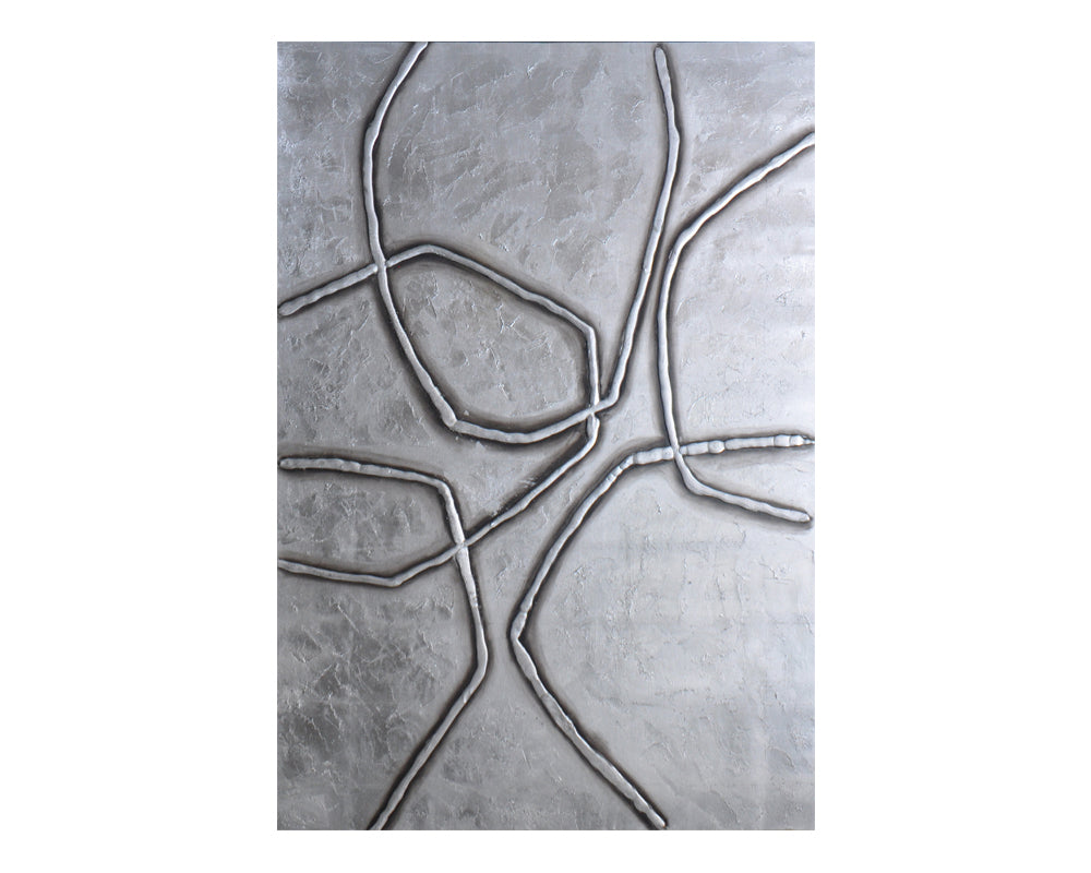 This silver painting features overlapping raised lines on the surface. Can be placed both vertically or horizontally. Painting features a high gloss finish on gallery wrapped canvas. Each artwork is hand-painted and will feature slight variations that make every piece unique.
