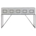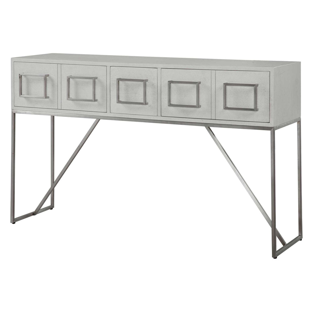 Clean Contemporary Styling, Featuring Oak Veneer Finished In A Soft White With Light Gray Distressing. Accented With Statement Hardware In Brushed Nickel Stainless Steel With A Coordinating Base. Has Two Double Drawers And One Single Drawer In The Center.