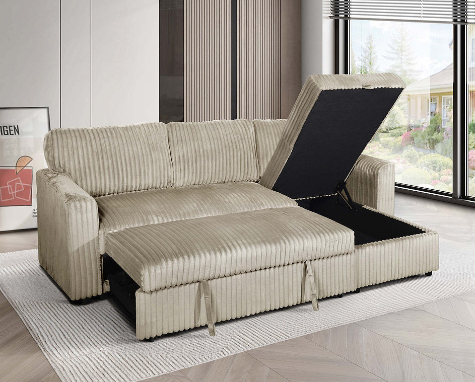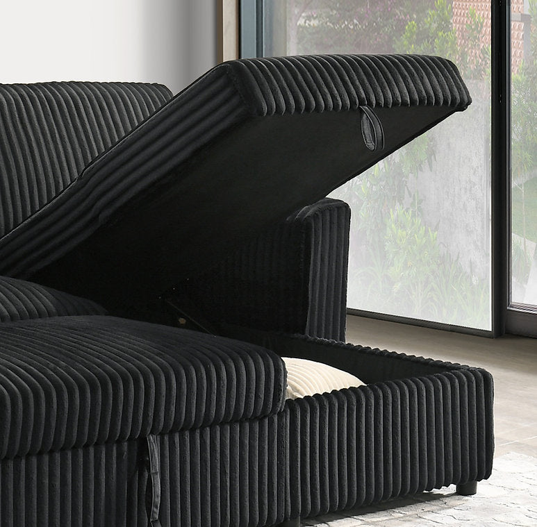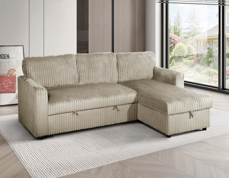 Crafted with soft-touch fur corduroy fabric, Anika offers a luxe feel and inviting texture, while plush cushions ensure sink-in comfort. The sectional easily opens into a bed, making it ideal for overnight guests. Plus, the lift-up storage compartment beneath the chaise is perfect for storing extra bedding, pillows, or living room essentials.