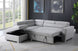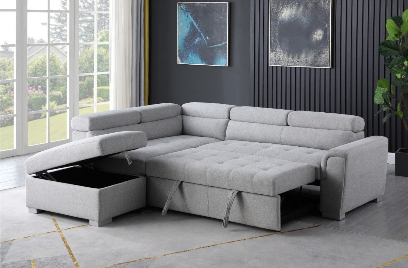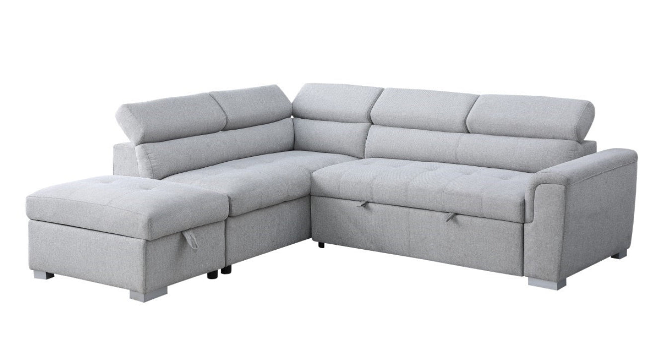 Create a functional seating and sleeping area in your home with this chic sectional sofa. Its neutral light grey finish effortlessly complements a wide range of contemporary interiors. This inviting sectional sofa is crafted with ultra-comfortable seating and easily converts into a convenient pullout bed to accommodate overnight guests as needed. A fashionable matching ottoman with hidden storage space lets you tuck blankets, remotes and other items neatly out of sight for a clutter-free look.