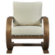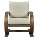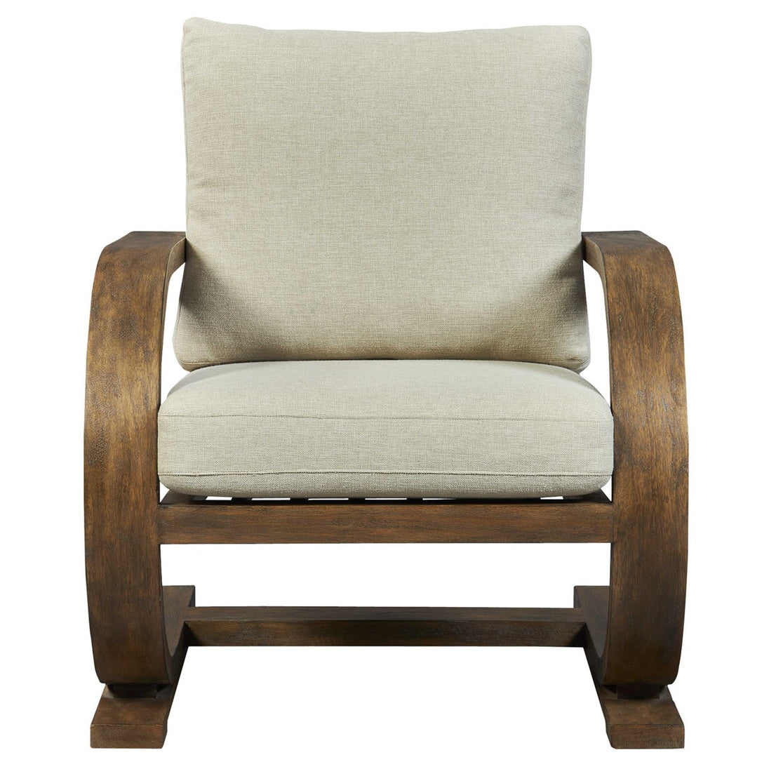 With art deco roots and transitional updates, the dramatic arm gives flexible movement in solid mango wood finished in weathered pecan with a gray wash. With a ladderback design and comfortable box cushions upholstered in a neutral polyester. Seat height is 19".
