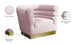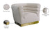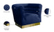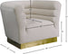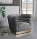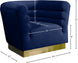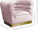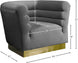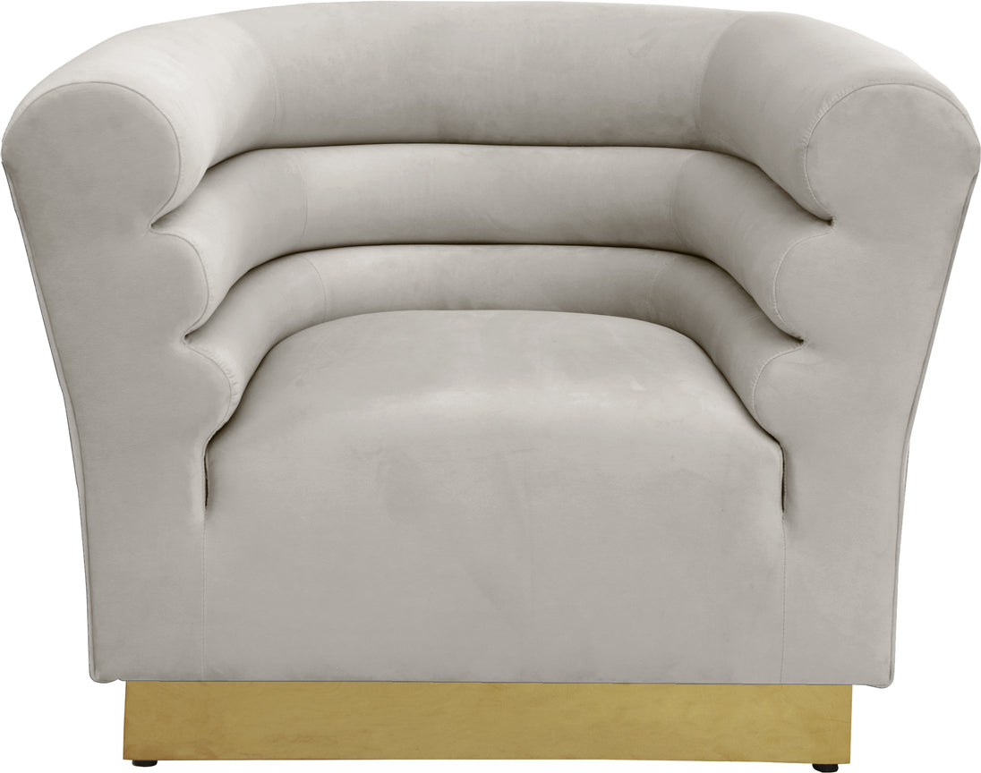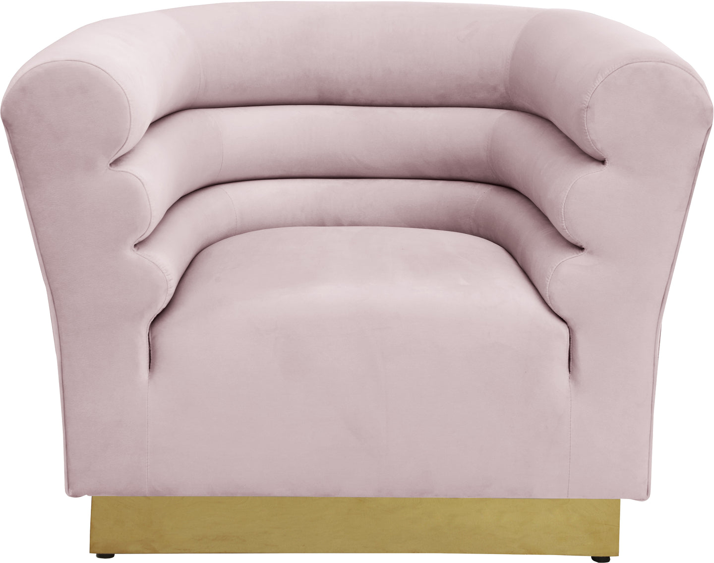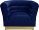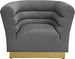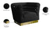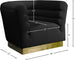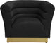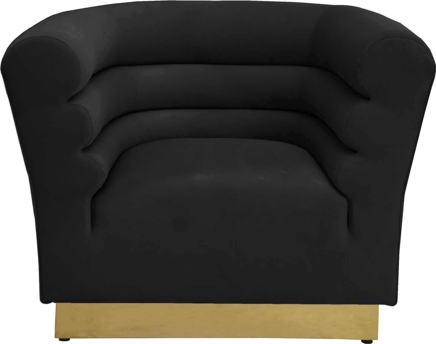 Add a bit of pizzazz to your living space with this Bellini Black Velvet Chair from Meridian Furniture. Rich black velvet upholstery offers you a luxurious place to curl up with a good book or rest in front of the TV after a long day, while horizontal Channel tufting creates texture and style. Its gold stainless steel base provides solid support, while adding to the chair's contemporary appearance. Its uniquely curved shape makes this piece a perfect addition to any room in your modern home.